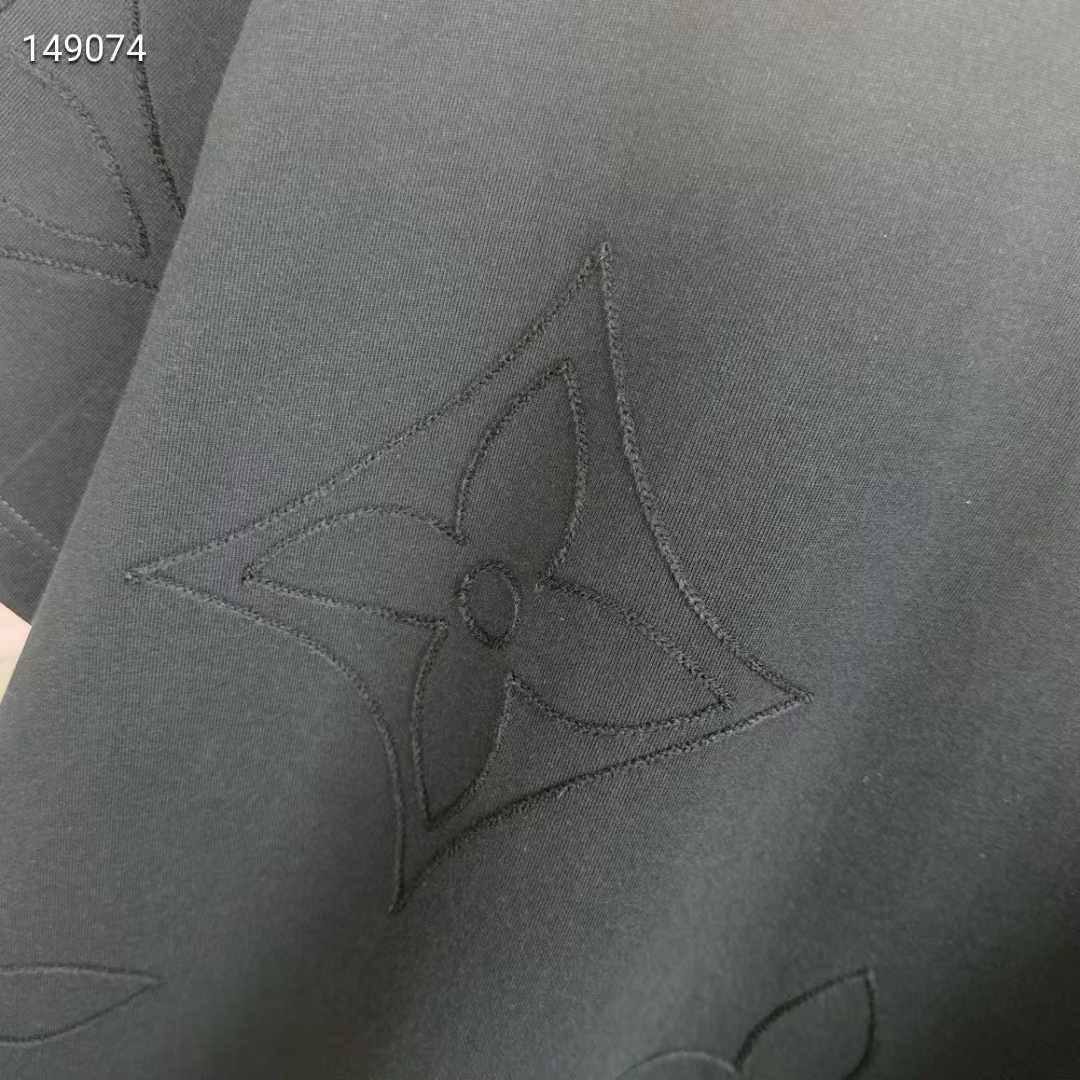 Футболка мужская Louis Vuitton LUX-113777 выполнена в классическом стиле с акцентом на логотипы бренда. Основной цвет футболки — черный. Текстура ткани однородная, с узором логотипов, нанесённых по всей поверхности. Предназначена для повседневной носки.