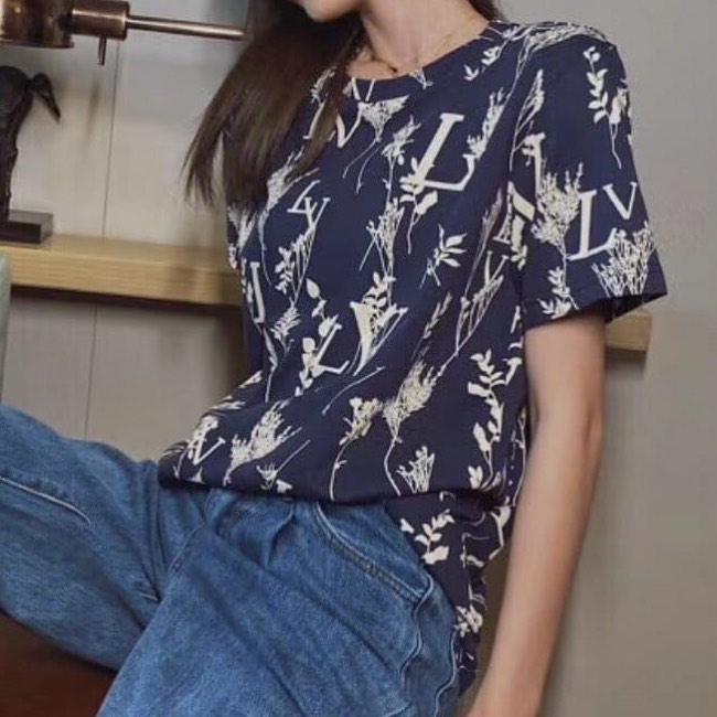 Женская футболка Louis Vuitton LUX-32278 выполнена в темно-синем цвете с оригинальным принтом, сочетающим узнаваемый логотип бренда с элементами флоры. Классический прямой крой и короткие рукава обеспечивают комфорт, делая эту модель идеальной для повседневного ношения. Футболка гармонично впишется в ваш гардероб, подчеркивая утонченный вкус и приверженность к элегантному стилю.