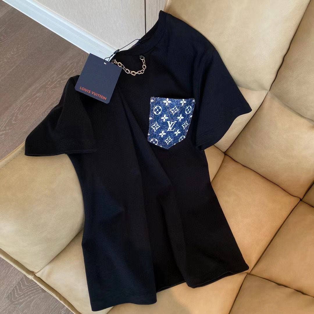 Футболка женская Louis Vuitton LUX-62895 — это стильный выбор для современной женщины, сочетающий в себе классический крой и узнаваемый брендовый дизайн. Черный цвет основы подчеркивает элегантность, а контрастный карман с фирменным принтом Louis Vuitton добавляет изюминку. Эта футболка идеально подходит для создания как повседневных, так и более изысканных образов, демонстрируя утонченный вкус.