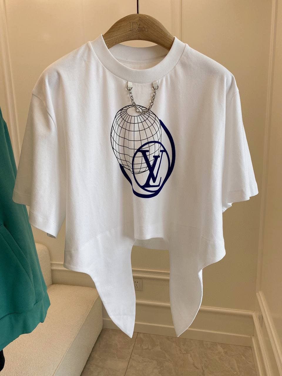 Louis Vuitton Футболка женская LUX-62986 – это стильная и современная модель, которая идеально дополнит ваш повседневный гардероб. Футболка выполнена в лаконичном дизайне с акцентом на уникальный принт и декоративную цепочку, что придает ей особый шарм. Эта вещь от Louis Vuitton подчеркнет вашу индивидуальность и хороший вкус.