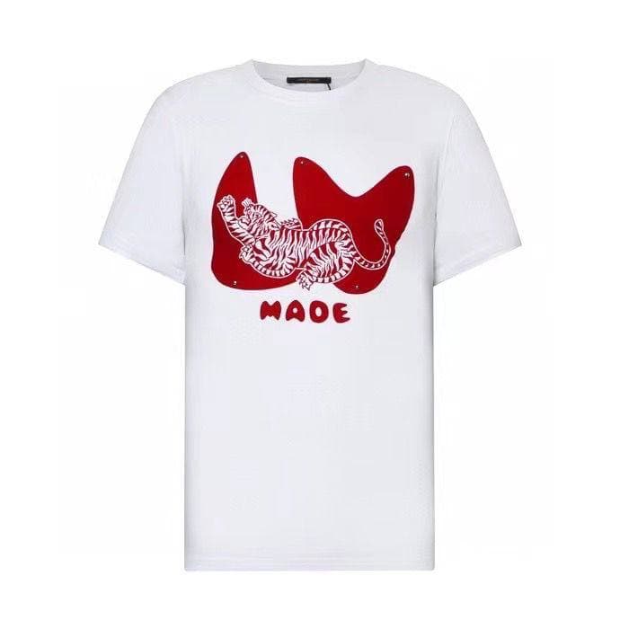 Эта белая женская футболка Louis Vuitton LUX-64124 является ярким примером современной моды, сочетающей в себе элементы уличного стиля и премиального бренда. На груди футболки расположен эффектный принт в виде красного стилизованного тигра, лежащего на красном фоне, с надписью "MAOE". Оригинальный дизайн делает эту футболку заметным элементом гардероба.