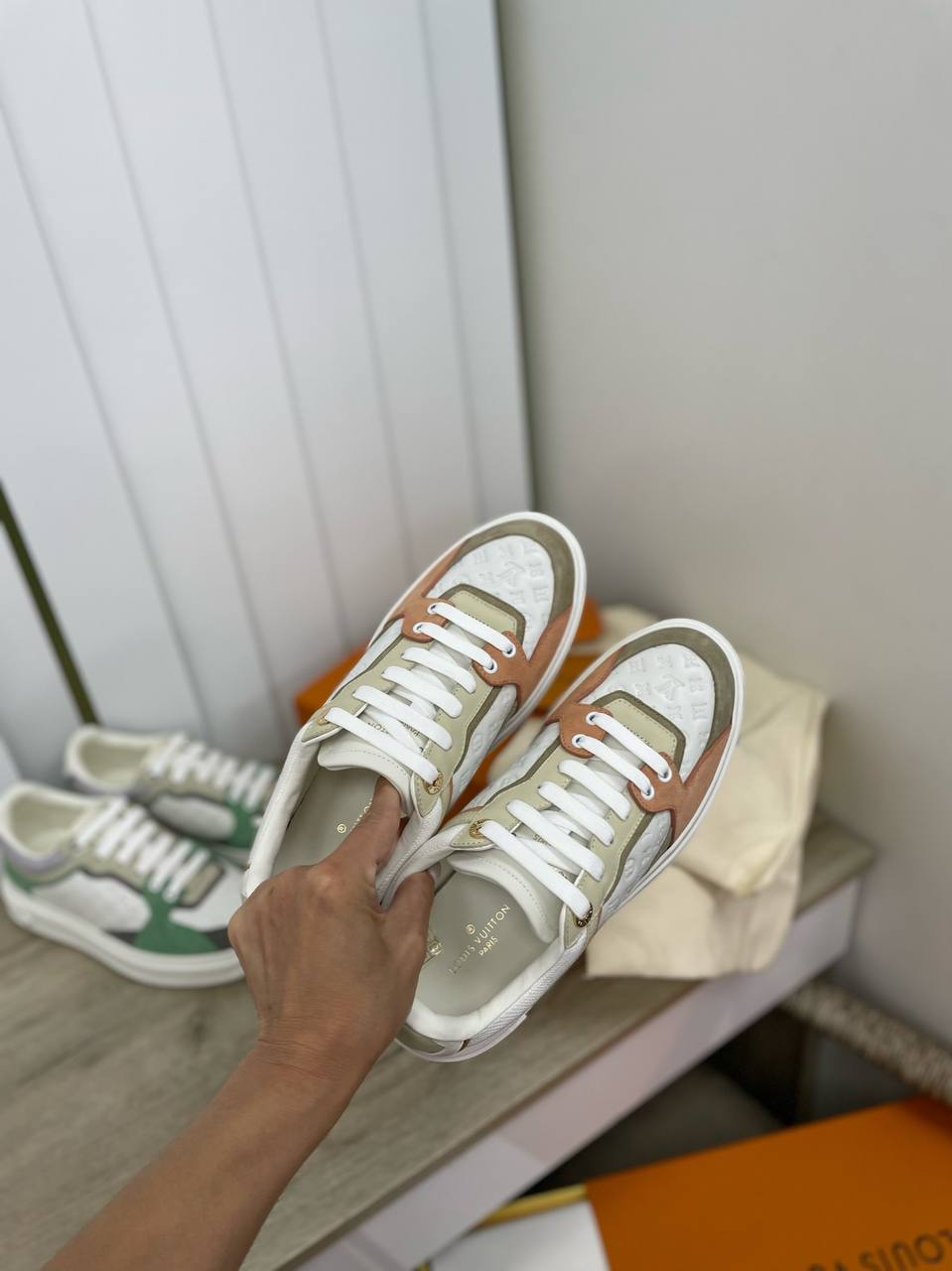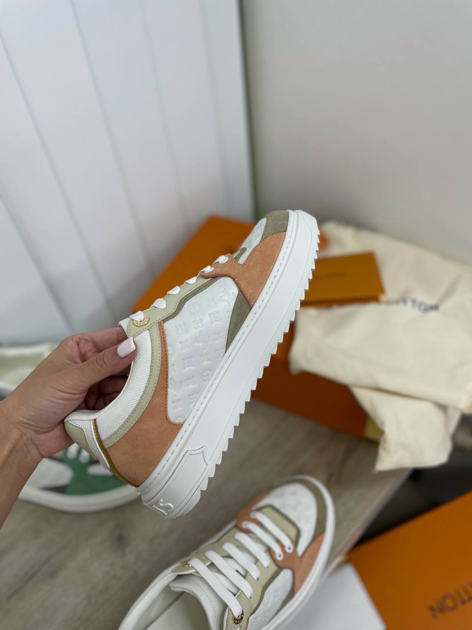 Кеды Louis Vuitton LUX-92913 — это стильные кеды, сочетающие в себе современный дизайн и роскошь. Они выполнены в сочетании белого, персикового и светло-коричневого цветов, что создает свежий и привлекательный вид. Данная модель отличается универсальностью, подходит для повседневной носки.