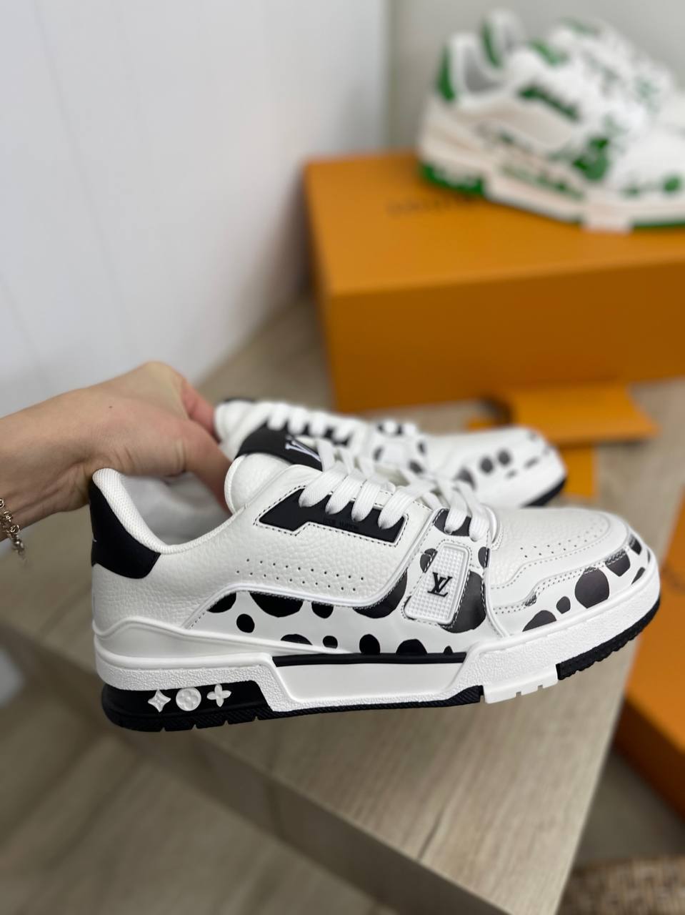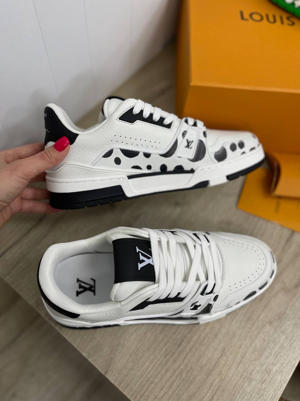 Кеды мужские Louis Vuitton LUX-86063 представляют собой стильную обувь в спортивном стиле. Белый цвет кед дополнен черными элементами и принтом в виде пятен, что делает их выразительными. Идеально подходят для создания модных повседневных образов.