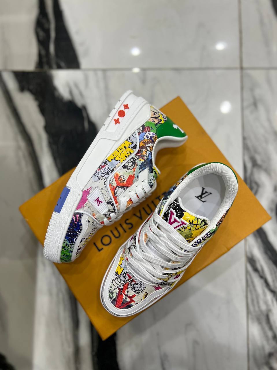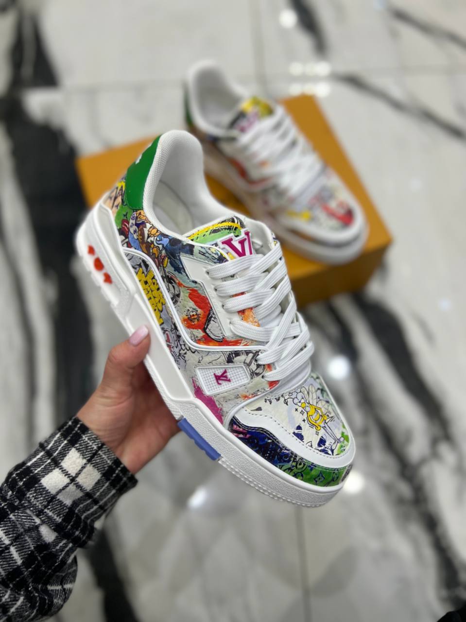 Кеды мужские Louis Vuitton LUX-88779 — это яркая и стильная обувь, которая сочетает в себе узнаваемый дизайн бренда и современный уличный стиль. Кеды выполнены в белом цвете с ярким красочным принтом, который придает им уникальность и выразительность. Идеально подойдут для создания запоминающихся образов.