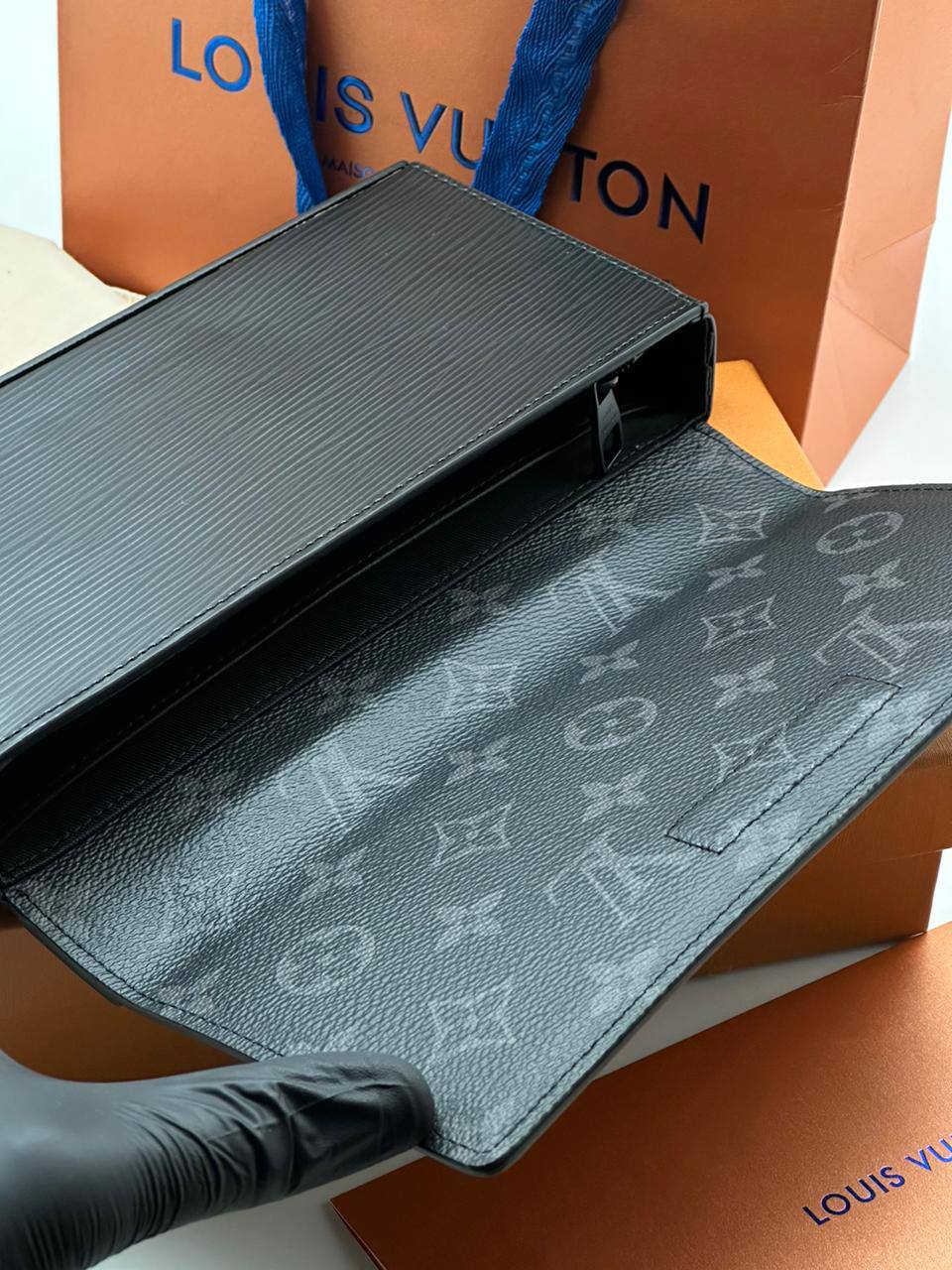 Клатч Louis Vuitton LUX-96330 — это стильный аксессуар от известного бренда, выполненный в элегантном черном цвете. Клатч имеет текстурированную поверхность, придающую ему изысканный вид. Его можно использовать как для повседневной носки, так и для особых случаев.