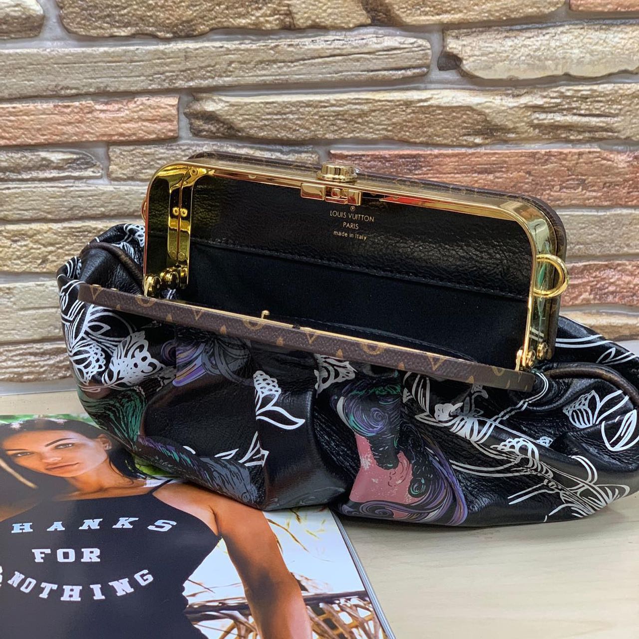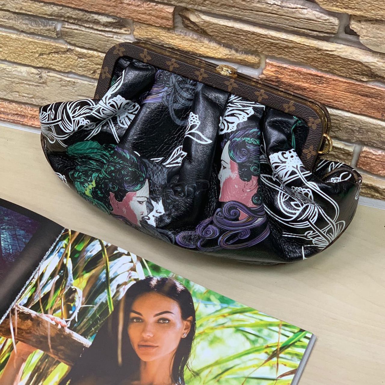 Клатч Louis Vuitton LUX-31184 представляет собой элегантный аксессуар, выполненный в узнаваемом стиле бренда. Черная основа с ярким принтом, изображающим стилизованные женские профили и растительные мотивы, придает изделию уникальность и художественную выразительность. Мягкие складки и изящная форма делают этот клатч идеальным дополнением к вечернему или коктейльному образу, подчеркивая изысканный вкус владелицы.