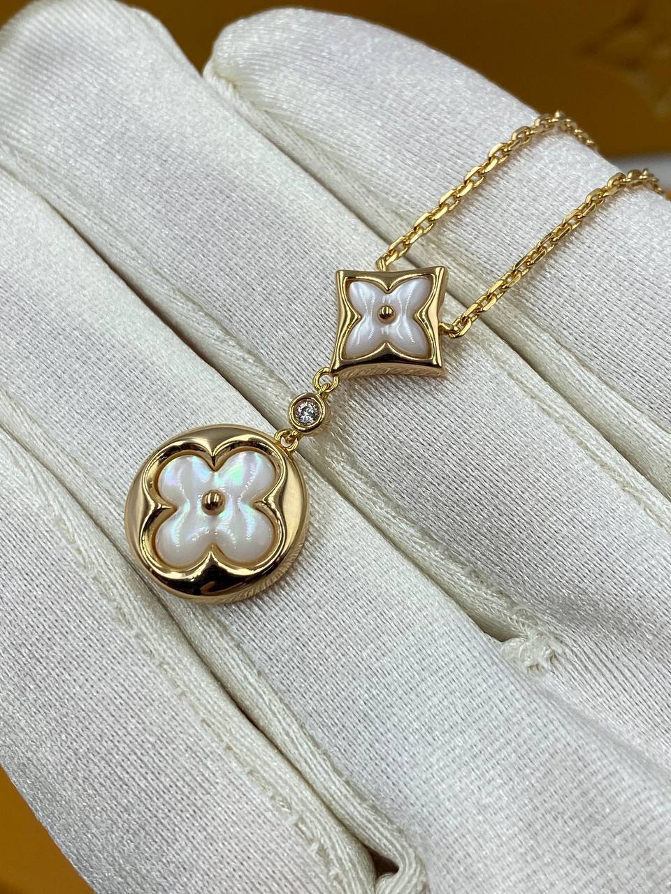 Колье Louis Vuitton LUX-99745 – это изысканное украшение, сочетающее в себе элегантность и утонченность. Колье выполнено в классическом стиле, с золотистой цепочкой и подвесками в виде цветков, украшенных перламутром. Этот аксессуар станет прекрасным дополнением к любому образу.