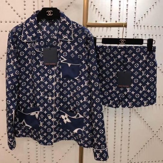 Представленный комплект Louis Vuitton LUX-31235 отличается роскошным дизайном и высоким качеством исполнения. Темно-синий фон украшен узнаваемым монограммным принтом бренда, дополненным белыми цветочными элементами, что придает изделию изысканный вид. Комплект идеально подходит для создания уютных домашних образов в стиле casual, подчеркивая статус и утонченный вкус владельца.