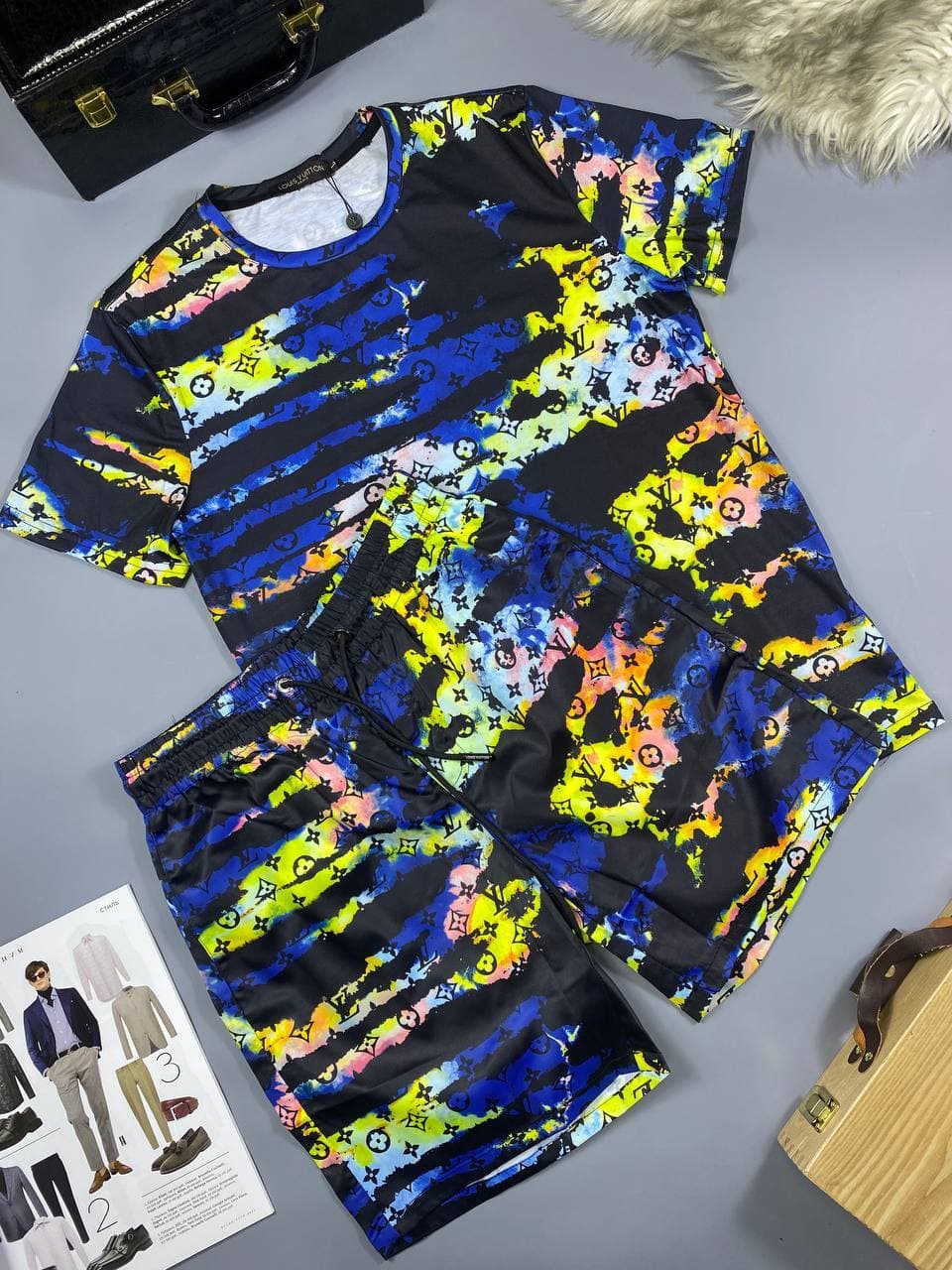 Представленный комплект Louis Vuitton LUX-64343 — это яркое и стильное решение для мужчин, сочетающее в себе узнаваемый дизайн бренда с современными трендами. Комплект включает футболку и шорты, выполненные в эффектной цветовой палитре с оригинальным принтом. Этот набор идеально подходит для создания непринужденных и запоминающихся образов в стиле casual.