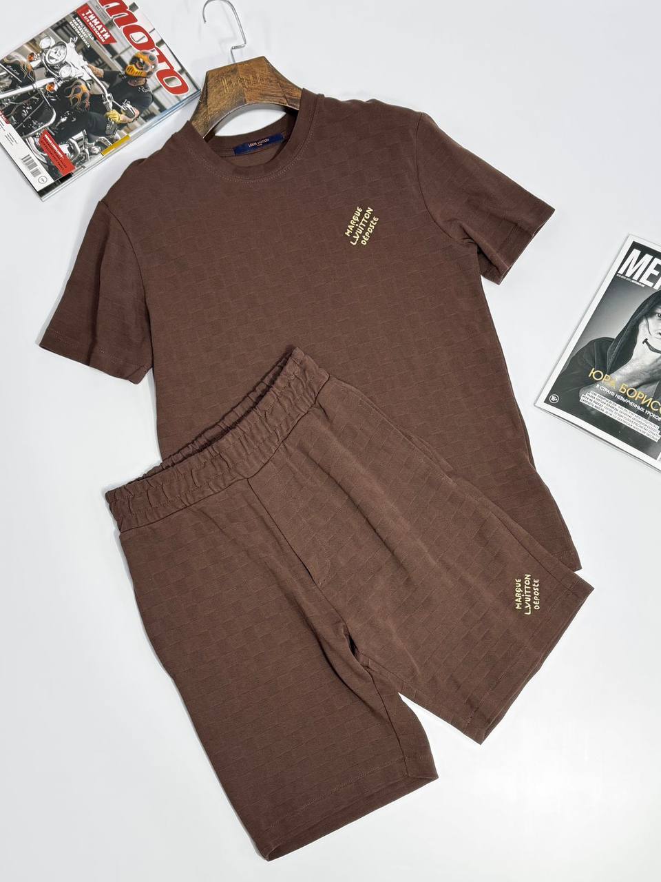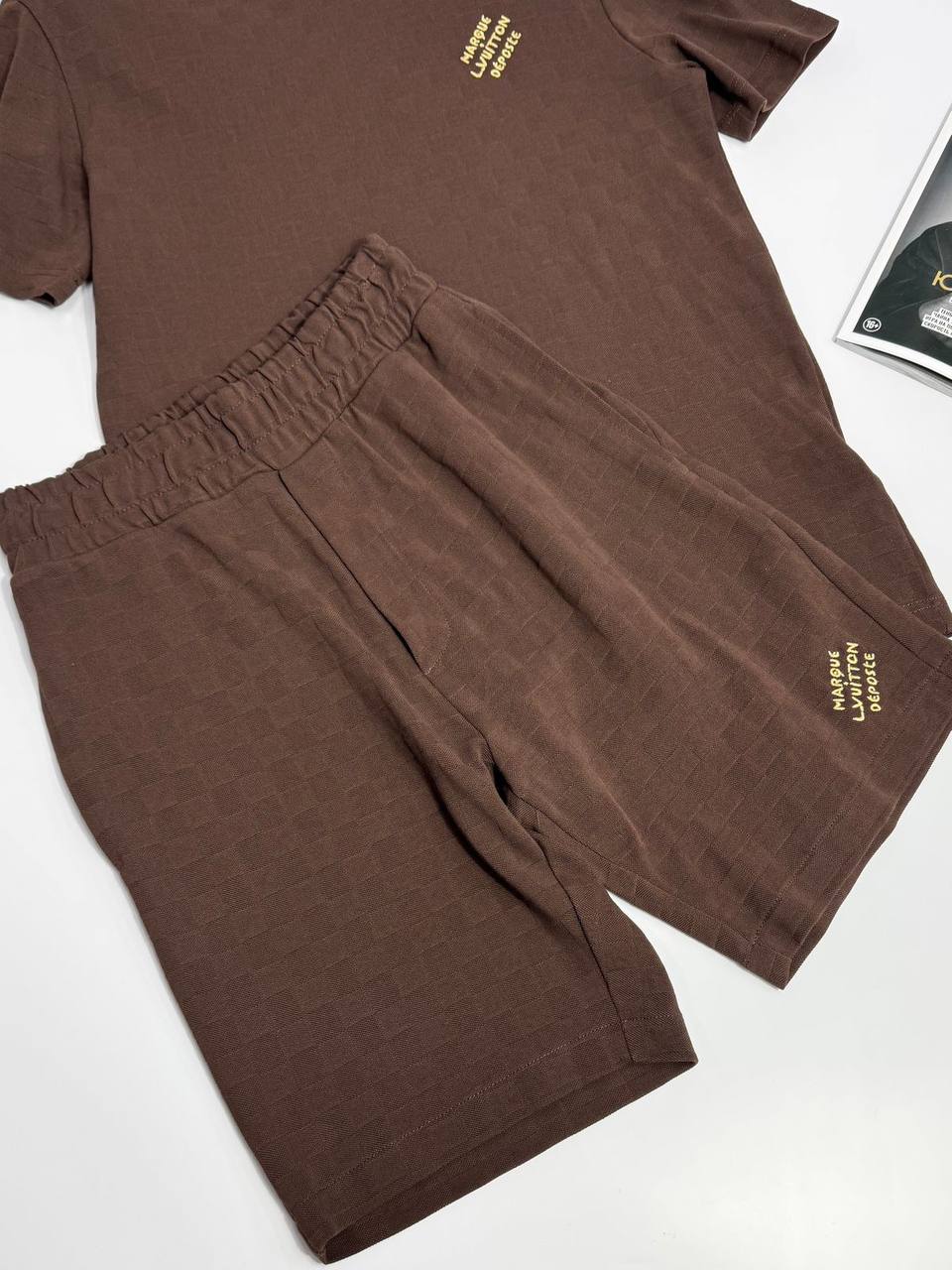 Комплект Louis Vuitton LUX-119880 представляет собой стильный комплект для повседневной носки. Он выполнен в коричневом цвете с текстурным узором, создающим эффектный визуальный акцент. Данный комплект идеально подходит для создания комфортного и элегантного образа в теплое время года.