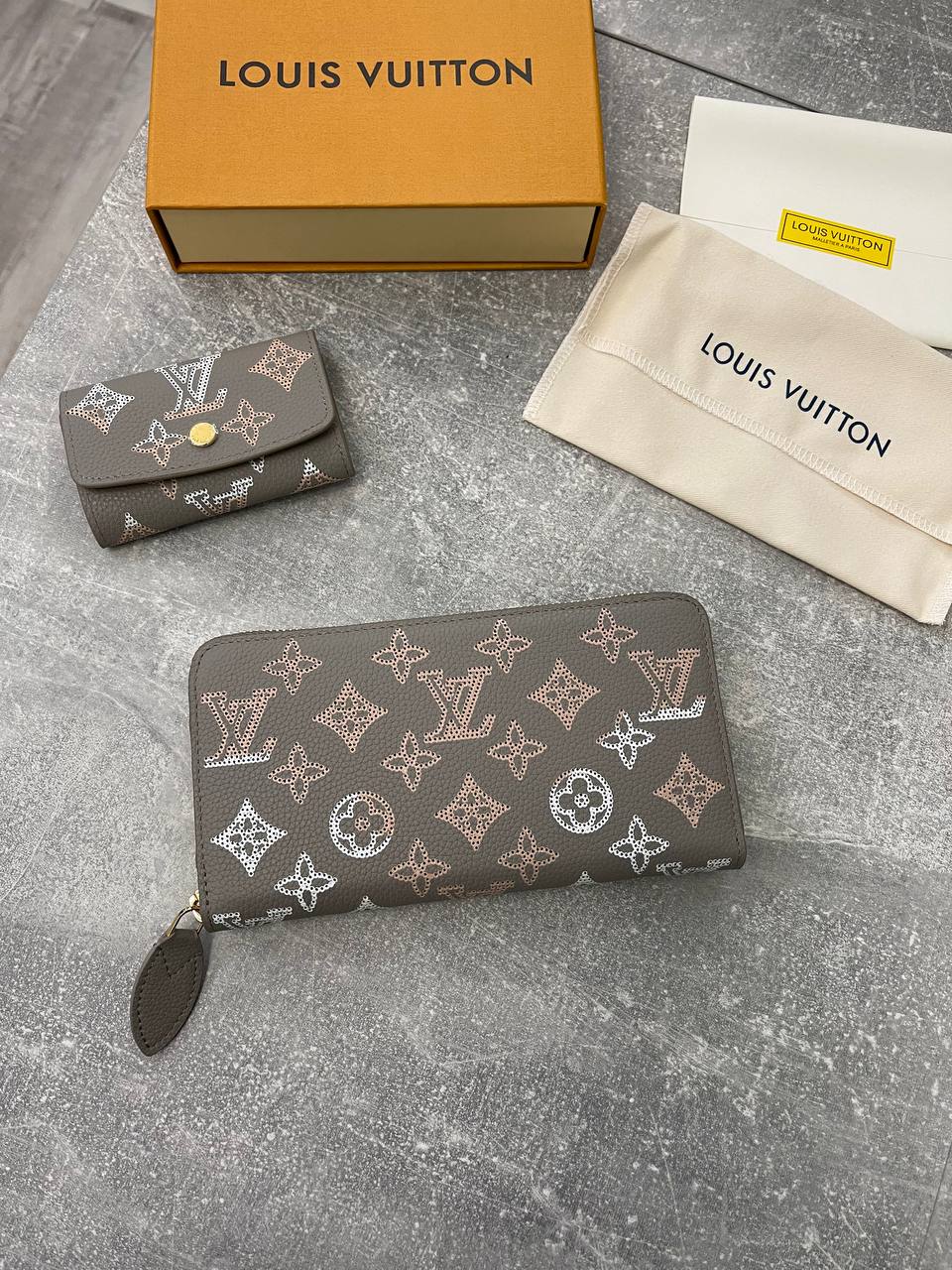 Кошелёк Louis Vuitton LUX-101076 выполнен в изысканном стиле бренда. Кошелёк с гравировкой монограммы и выполнен в сером цвете с акцентами пудрового оттенка. Идеален для хранения денежных средств, карт и других мелочей.