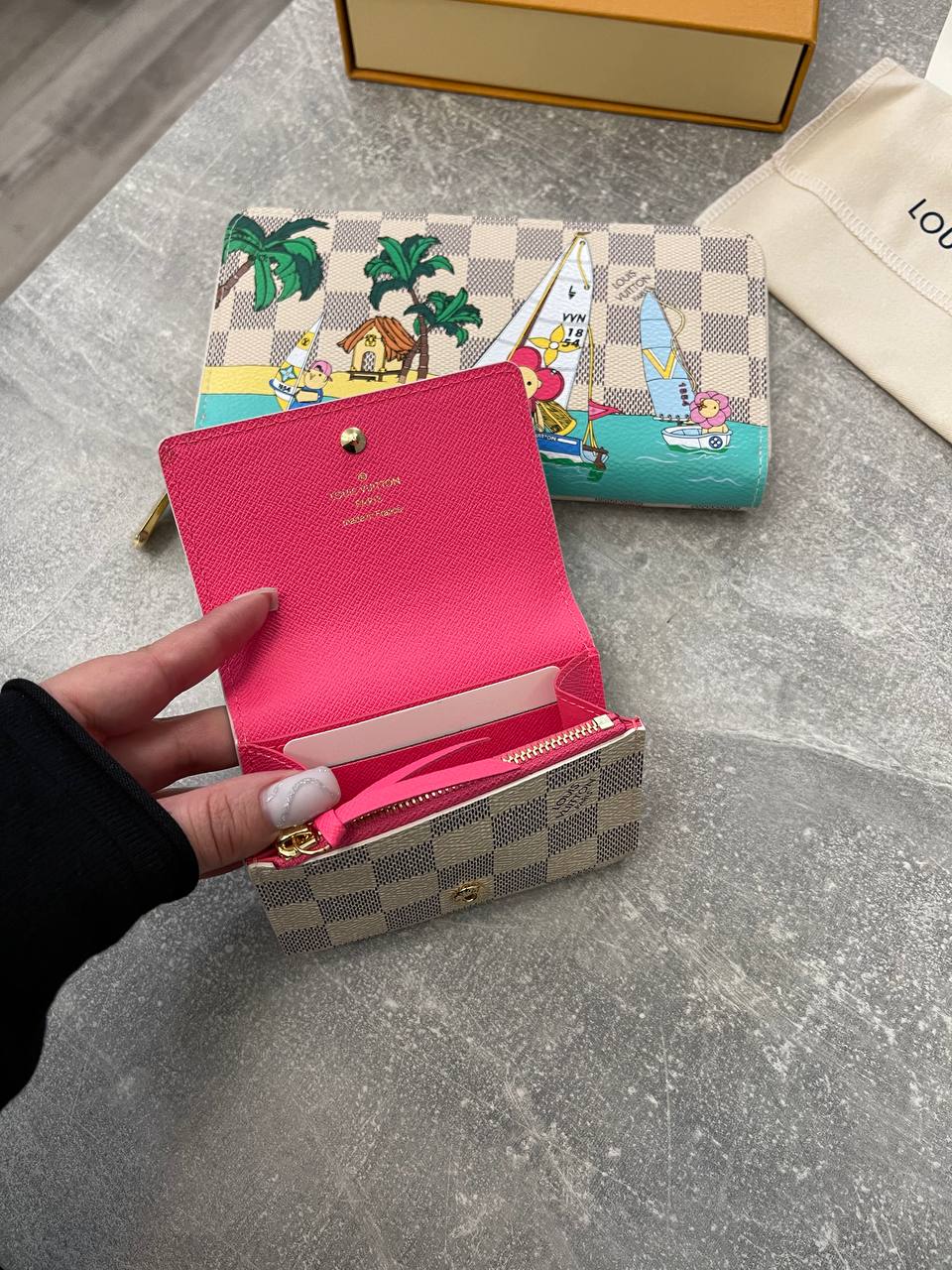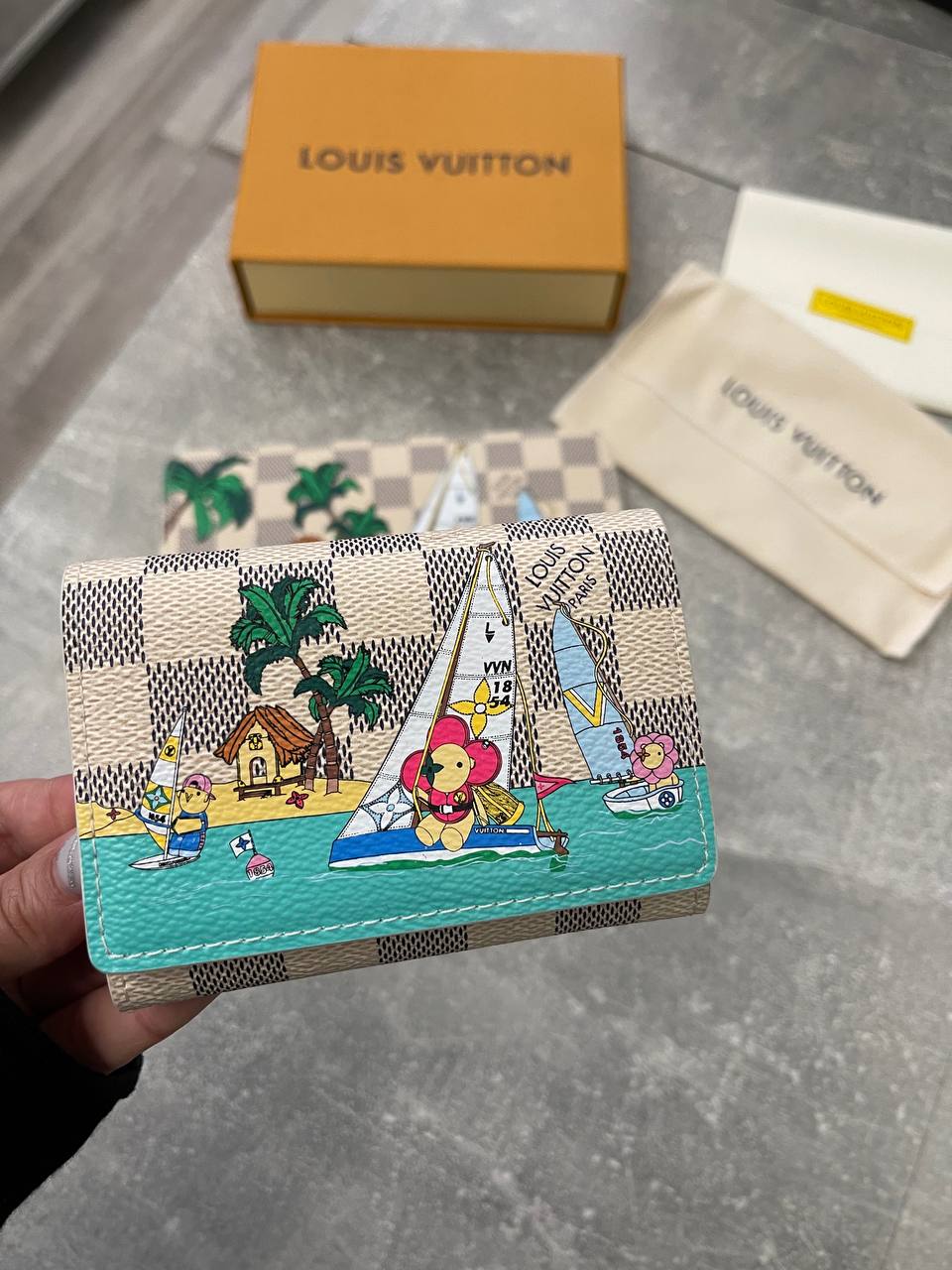 Кошелёк Louis Vuitton LUX-101078 — это стильный аксессуар, который сочетает в себе элегантность и игривый дизайн. Он выполнен в клетчатом узоре с ярким принтом, изображающим морскую тематику. Кошелёк идеально подходит для повседневного использования, подчеркивая индивидуальность и вкус своего владельца.