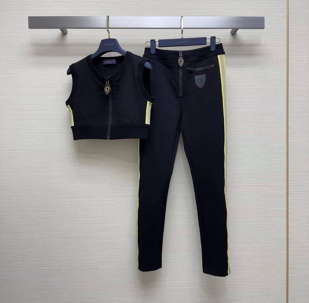 Костюм Louis Vuitton LUX-103328 – это стильный спортивный костюм, выполненный в современном дизайне. Он представляет собой комплект, состоящий из укороченного жилета на молнии и брюк. Костюм выполнен в черном цвете с яркими жёлтыми полосами по бокам, что придает ему динамичный и узнаваемый вид. Предназначен для активного образа жизни и повседневной носки.