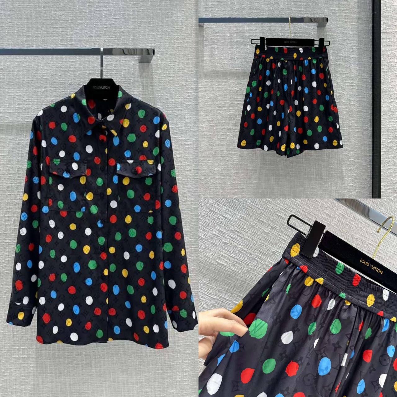 Костюм Louis Vuitton LUX-86882 — это яркий и стильный комплект, сочетающий в себе рубашку с длинными рукавами и шорты. Костюм выполнен в насыщенном черном цвете с красочным принтом в горошек. Этот костюм подойдет для создания эффектных образов в повседневной жизни и на мероприятиях.
