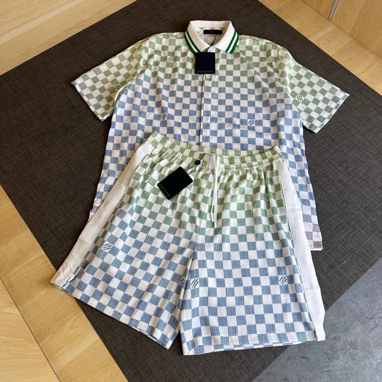 Мужской костюм Louis Vuitton LUX-119213 - это стильный комплект, состоящий из рубашки-поло с короткими рукавами и шорт. Костюм выполнен в узнаваемом стиле бренда, украшен клетчатым узором в сочетании синего, зеленого и белого цветов. Этот костюм - отличный выбор для создания летних образов.
