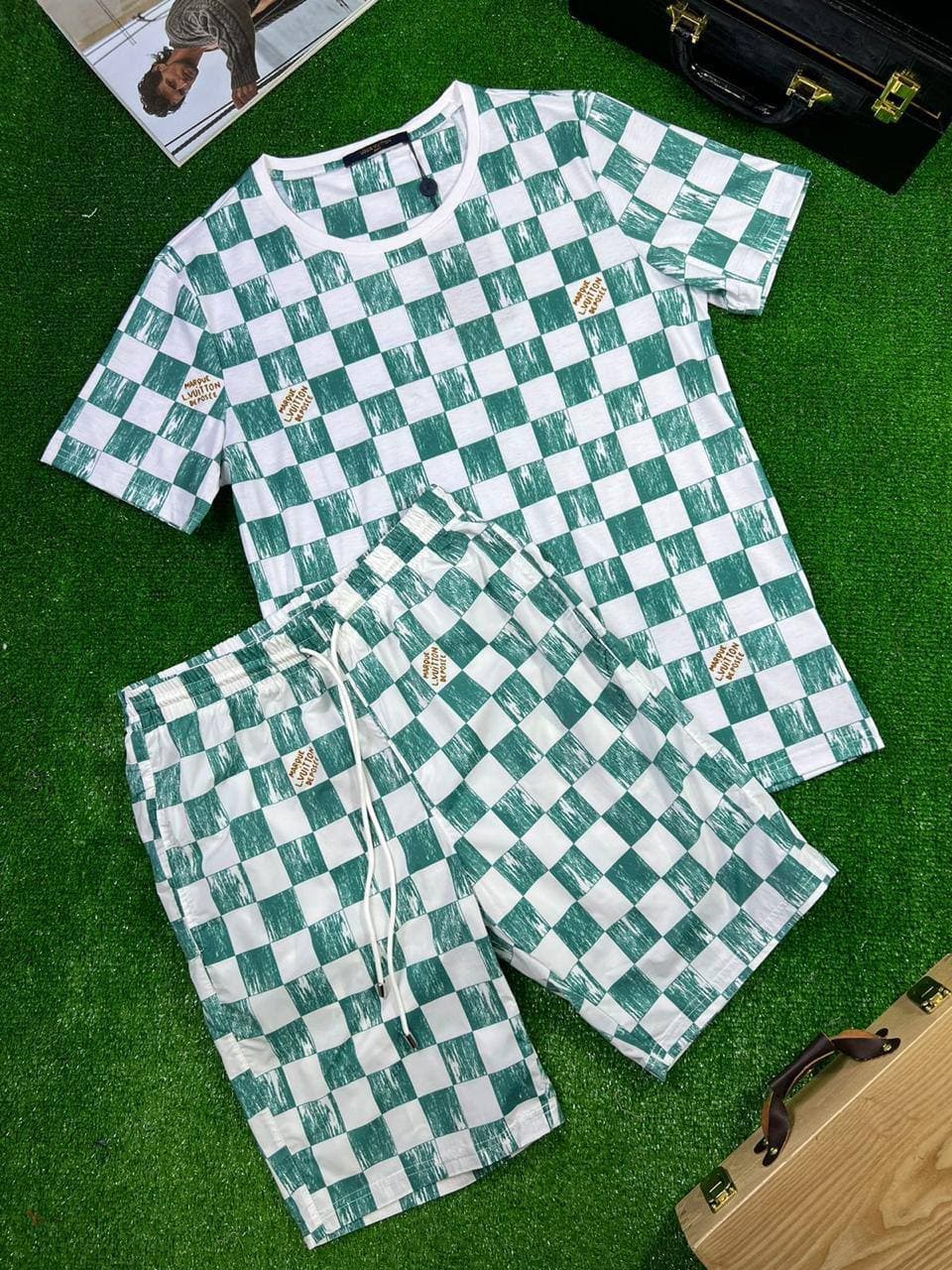 Этот мужской костюм Louis Vuitton, артикул LUX-62650, представляет собой стильный комплект, выполненный в игривом шахматном узоре. Он идеально подходит для создания непринужденных, но модных летних образов. Комплект состоит из футболки и шорт, что делает его универсальным выбором для отдыха и повседневной носки.