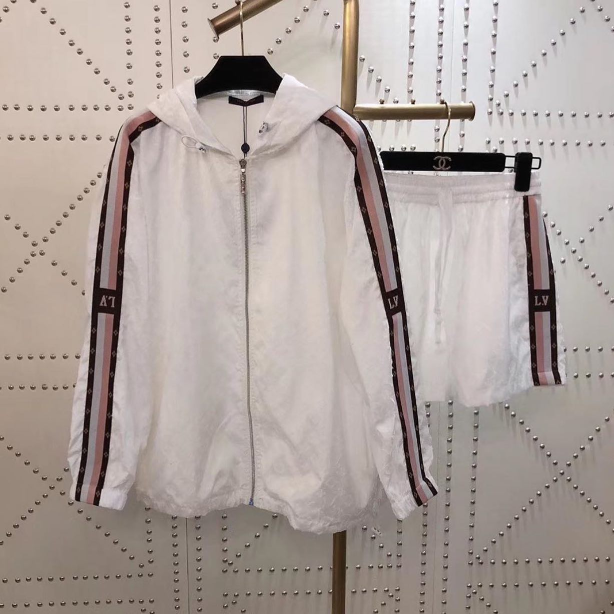 Костюм спортивный Louis Vuitton LUX-30979 представляет собой элегантный комплект, сочетающий комфорт и узнаваемый стиль бренда. Белый цвет изделий, дополненный фирменными полосами с логотипами LV, создает изысканный и актуальный образ. Комплект идеально подходит для создания спортивных и кэжуал образов, обеспечивая свободу движений и ощущение роскоши.