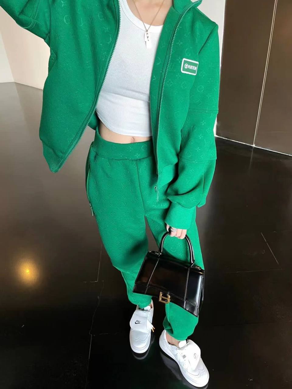 Элегантный спортивный костюм Louis Vuitton LUX-66763 представлен в ярком зеленом цвете, что делает его стильным выбором для современной женщины. Комплект состоит из худи на молнии и брюк, выполненных в едином дизайне с характерным монограммным принтом бренда. Этот костюм идеально подходит для создания расслабленных, но при этом модных образов.