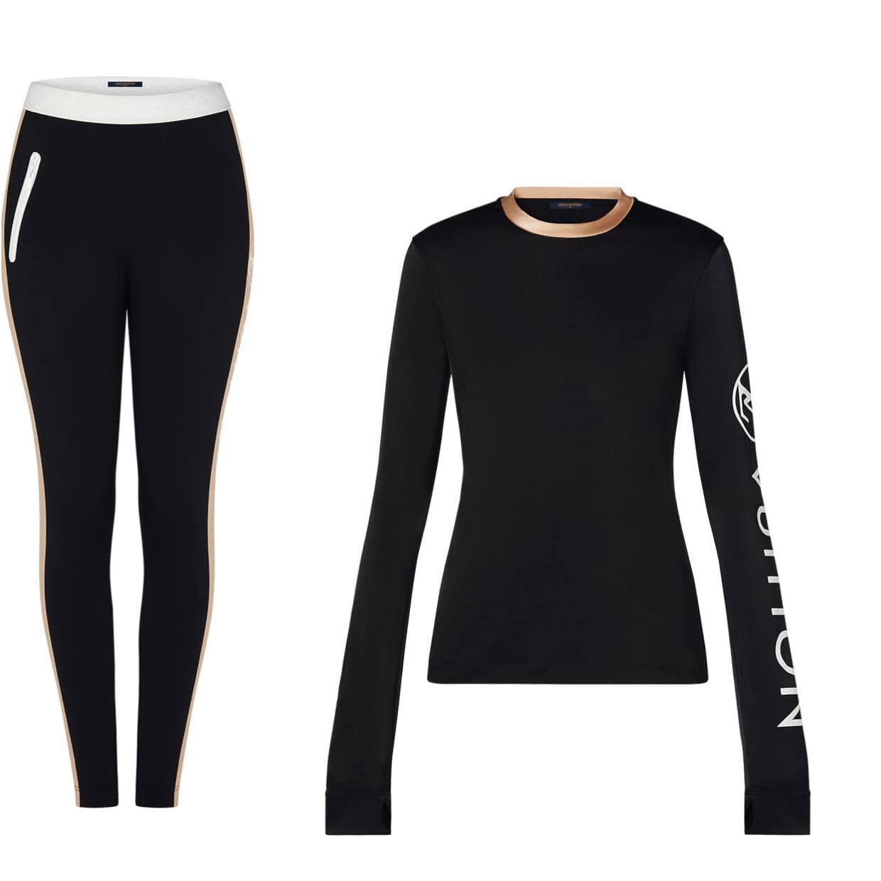 Этот спортивный костюм Louis Vuitton LUX-56515, выполненный в классическом черном цвете с контрастными бежевыми вставками и фирменным логотипом, идеально подходит для активного образа жизни. Комплект состоит из лонгслива с круглым вырезом и спортивных леггинсов, обеспечивая стильный и функциональный вид.