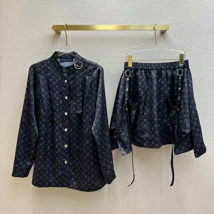 Костюм женский Louis Vuitton LUX-81603 представляет собой элегантный комплект, который состоит из рубашки и юбки. Комплект выполнен в классическом стиле с узнаваемым монограммным принтом. Темный цвет костюма добавляет ему универсальности и делает его подходящим для различных ситуаций.