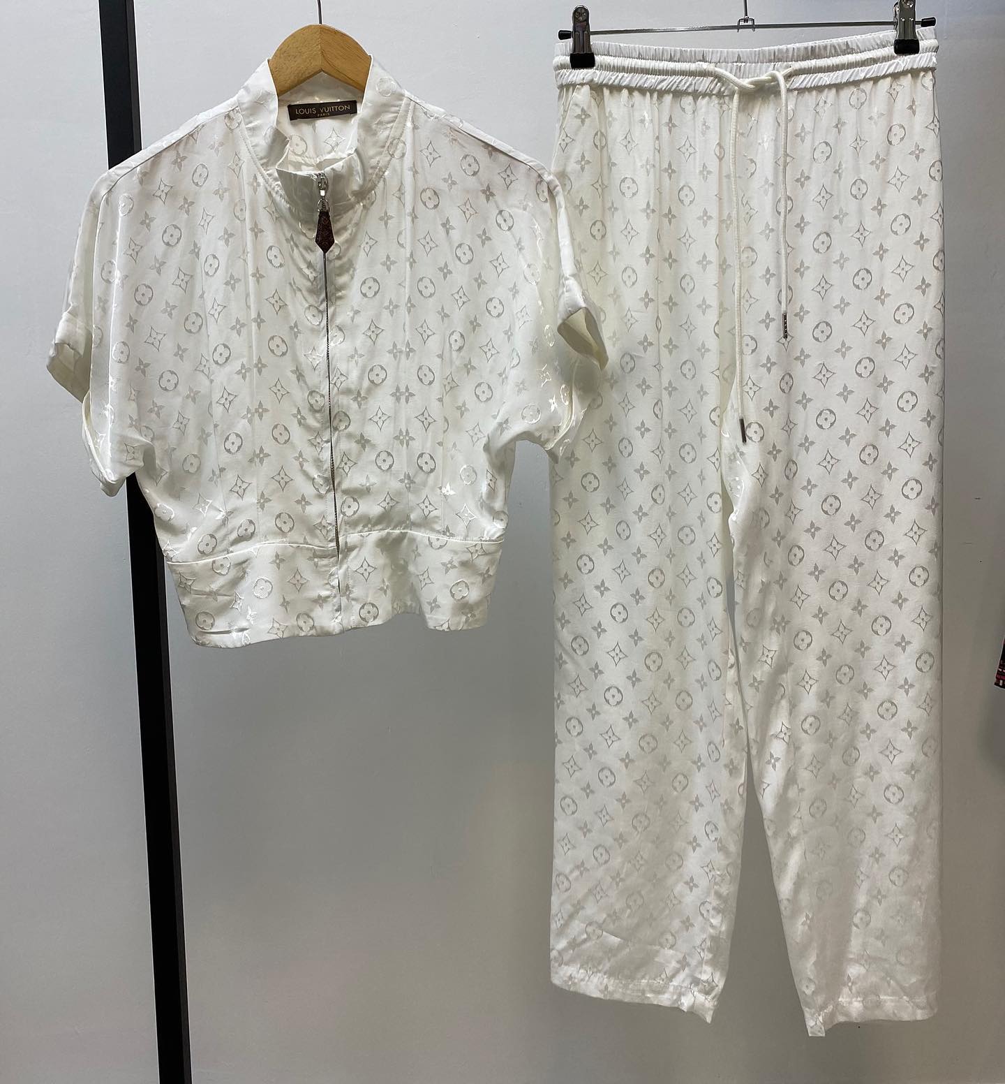 Женский костюм Louis Vuitton LUX-32870 представляет собой элегантный комплект, выполненный в стиле casual-chic. Комплект состоит из укороченной куртки-бомбера с короткими рукавами и брюк прямого кроя. Оба изделия украшены фирменным монограммным принтом бренда, что придает им узнаваемый и роскошный вид. Этот костюм идеально подойдет для создания стильных и комфортных образов на каждый день.