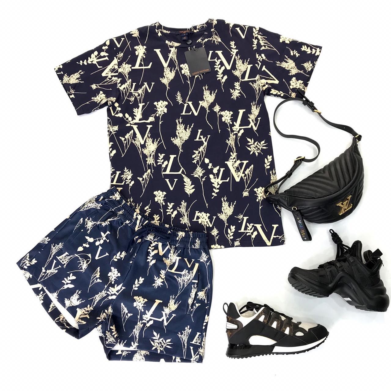 Представляем женский костюм Louis Vuitton LUX-33132, выполненный в темно-синем цвете с изысканным цветочным принтом и монограммами бренда. Этот стильный комплект, состоящий из футболки и шорт, идеально подходит для создания модного повседневного образа.