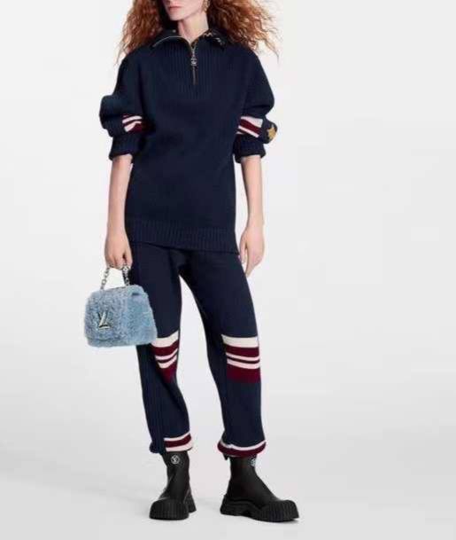 Костюм женский Louis Vuitton LUX-81958 представляет собой стильный комплект, выполненный в темно-синем цвете. Комплект включает в себя свитер с воротником на молнии и брюки с акцентными полосками. Этот костюм подойдет для создания современного и комфортного образа.