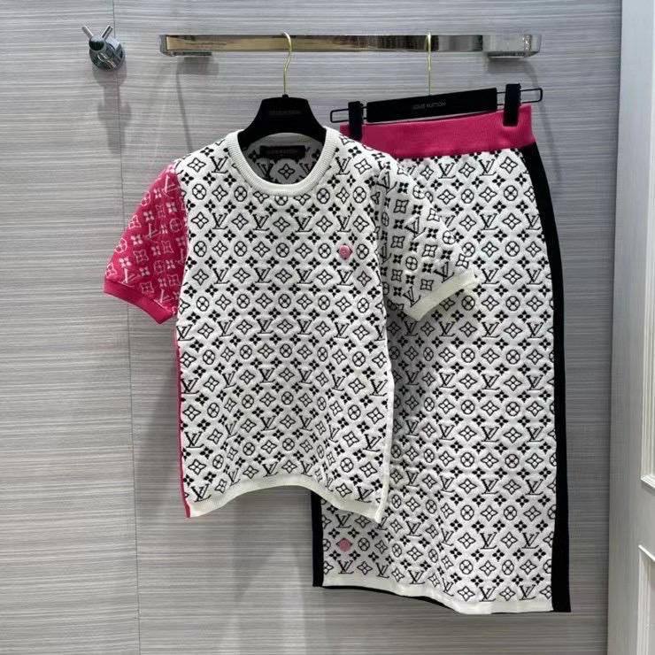 Представленный женский костюм Louis Vuitton LUX-67240 – это элегантный и узнаваемый комплект, сочетающий в себе классический дизайн бренда и современный стиль. Костюм состоит из короткого топа с короткими рукавами и юбки, выполненных в характерной монограмме Louis Vuitton. Яркие контрастные детали, такие как розовые рукава и отделка юбки, придают образу динамичность и выразительность, делая его идеальным выбором для стильных леди.