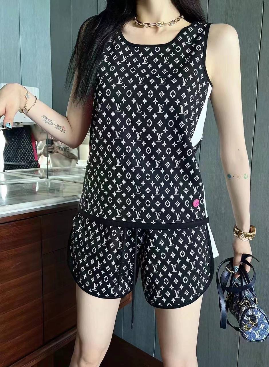 Стильный женский костюм Louis Vuitton LUX-68545 выполнен в классическом черном цвете с узнаваемым монограммным принтом. Комплект состоит из удобной майки без рукавов и шорт, что делает его идеальным выбором для повседневного ношения и активного отдыха. Дизайн костюма сочетает в себе элегантность и комфорт, подчеркивая изысканный вкус обладательницы.