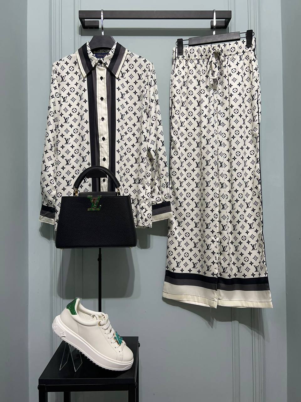 Костюм женский Louis Vuitton LUX-93922 — это элегантный ансамбль, который сочетает в себе стиль и комфорт. Костюм выполнен в классическом стиле, с фирменным принтом бренда. Белый фон дополнен черными монограммами, что придает изделию узнаваемость и роскошь.