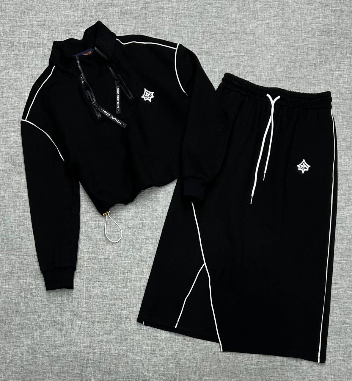 Костюм женский Louis Vuitton LUX-101122 – это стильный и современный комплект, состоящий из укороченного худи на молнии и юбки. Комплект выполнен в черном цвете с белыми контрастными полосами и декоративными элементами. Этот костюм подойдет для повседневной носки, создавая комфортный и модный образ.