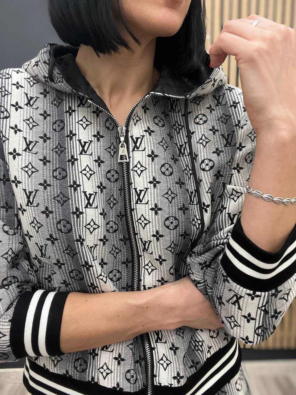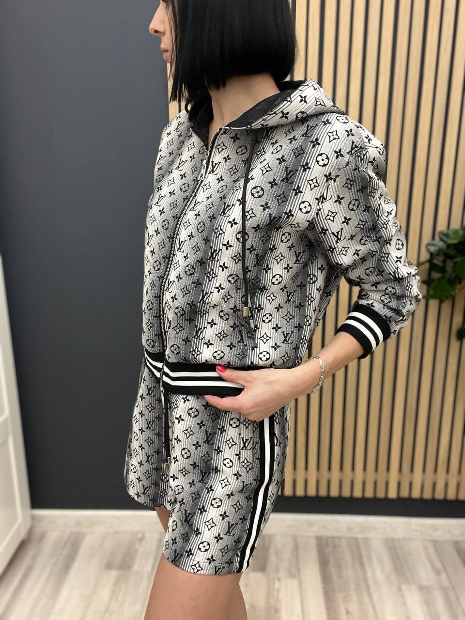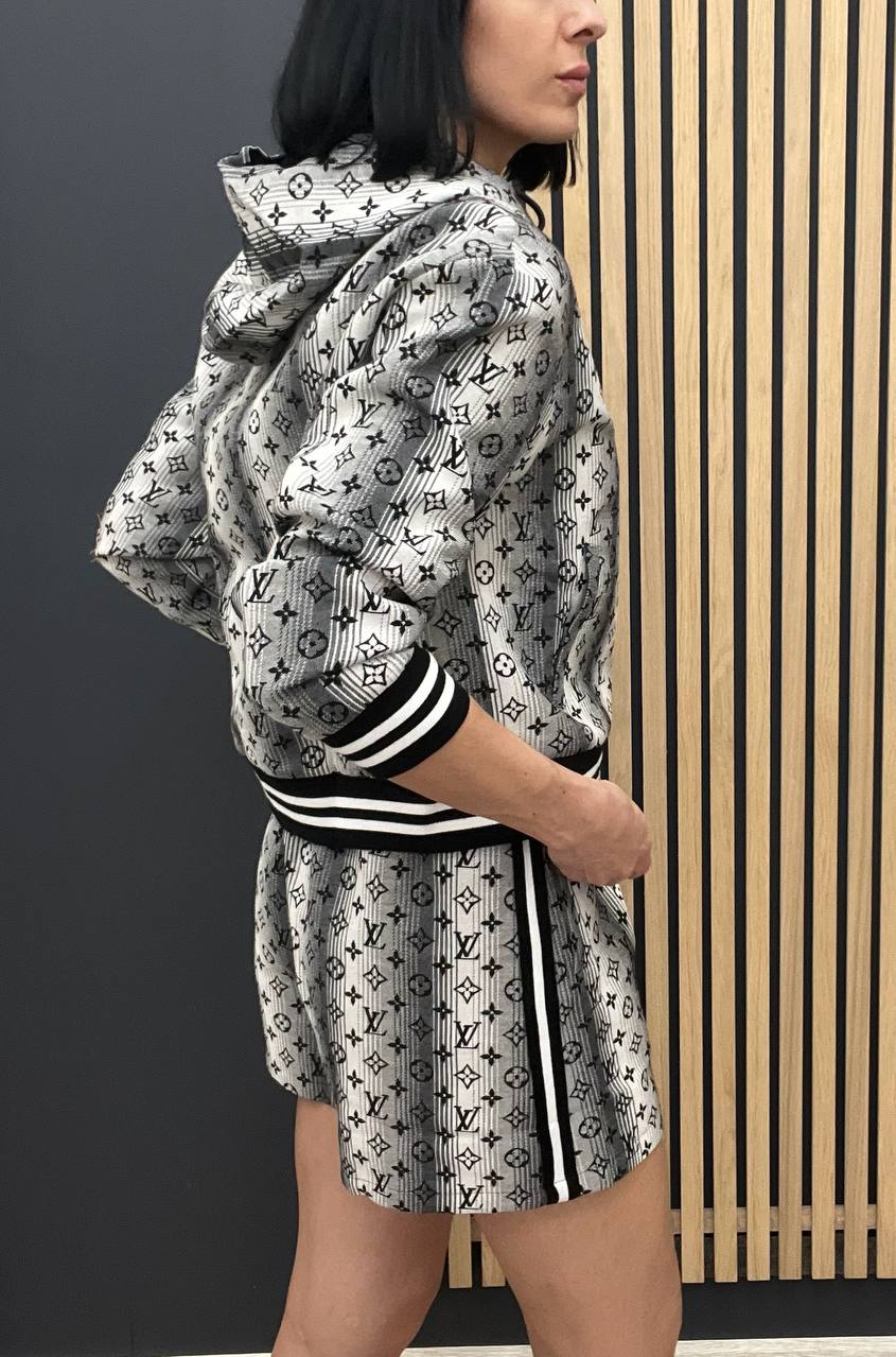 Костюм женский Louis Vuitton LUX-104082 представляет собой стильный спортивный комплект в классическом стиле. Он выполнен в серо-белой гамме с узнаваемым принтом. Костюм состоит из худи на молнии и шорт с контрастными полосками.