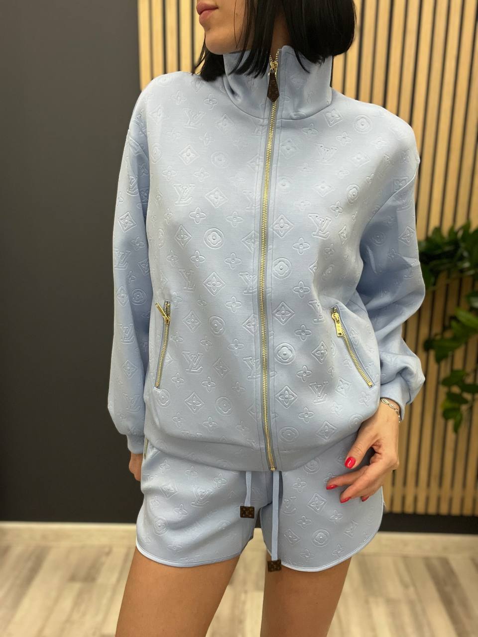 Женский костюм Louis Vuitton LUX-104084 представляет собой стильный спортивный комплект, состоящий из толстовки на молнии и шорт. Костюм выполнен в нежном голубом цвете с текстурированным узором, характерным для бренда. Этот комплект идеально подходит для создания комфортного и модного образа.