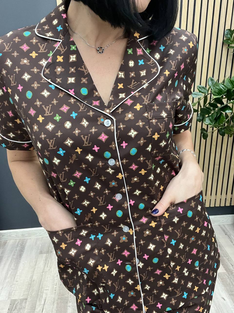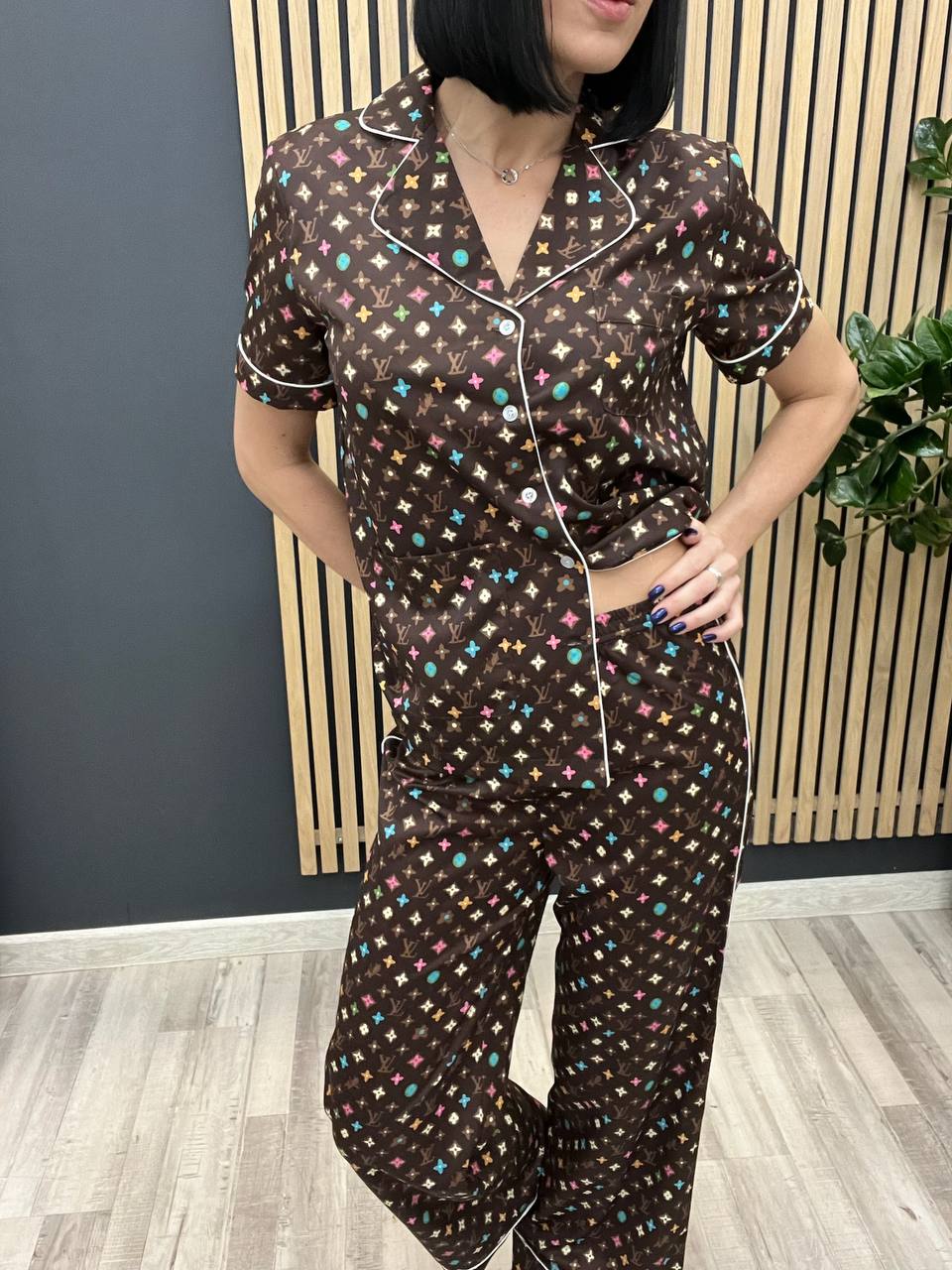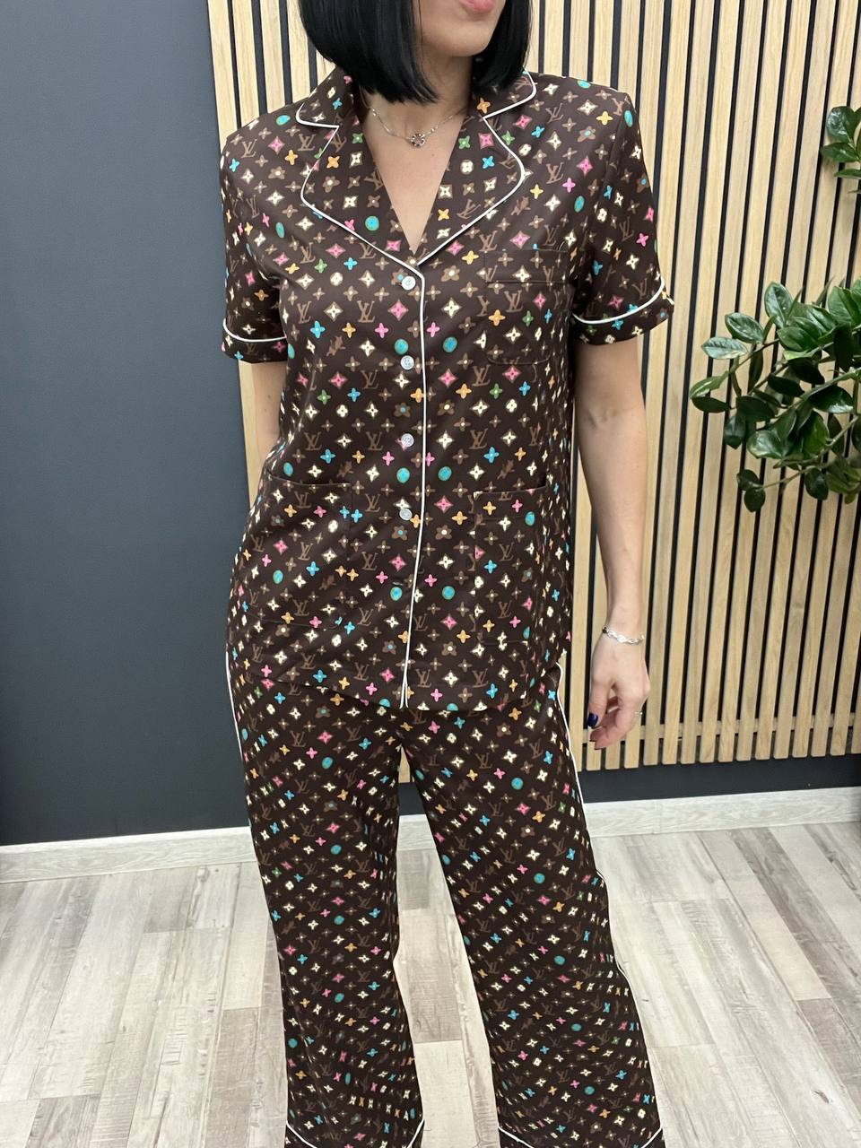 Костюм женский Louis Vuitton LUX-105107 представляет собой стильный комплект, состоящий из рубашки с короткими рукавами и брюк. Комплект выполнен в коричневых тонах с фирменным принтом, добавляющим узнаваемости и элегантности. Идеален для повседневной носки или создания расслабленных образов.