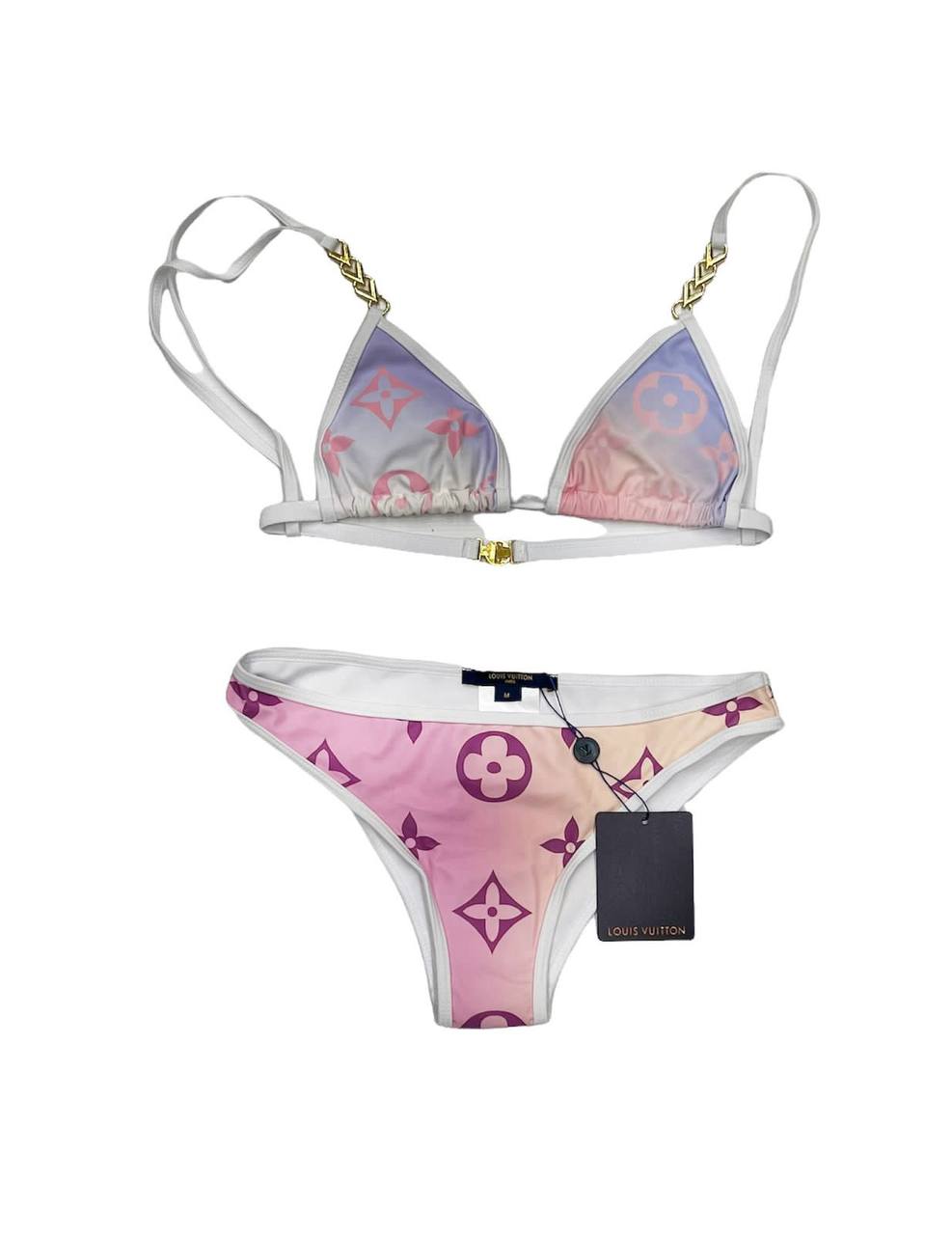 Этот купальник Louis Vuitton LUX-68639 представляет собой элегантный комплект, выполненный в ярком градиентном дизайне с узнаваемым принтом бренда. Верх и низ модели украшены фирменными монограммами, переходящими от нежно-сиреневых оттенков к розовым и персиковым. Детали с золотистым декором на бретелях и застежке добавляют изделию роскоши.