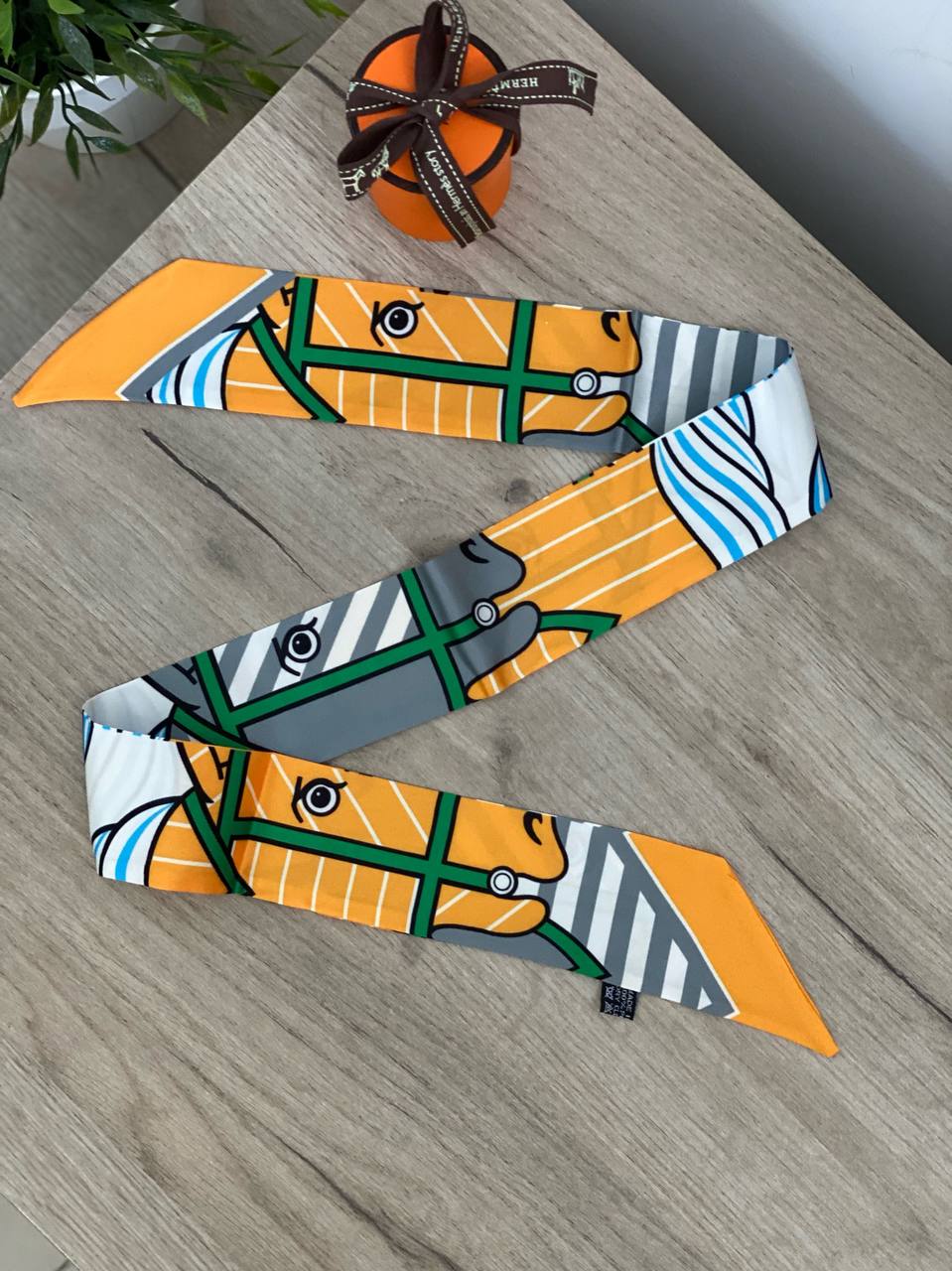 Эта яркая лента Twilly Louis Vuitton LUX-52945, выполненная в стиле анималистики, станет изысканным дополнением к вашему образу. Смелый принт с изображением лошадиной упряжи в оранжевых, серых и синих тонах придает изделию неповторимый шарм. Лента из высококачественного материала обладает элегантным блеском и приятна на ощупь, что делает ее идеальным аксессуаром для придания индивидуальности вашему стилю.