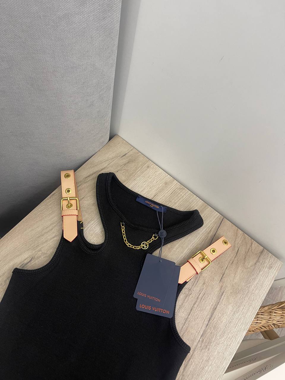 Майка Louis Vuitton LUX-104325 — это элегантный и стильный предмет гардероба от известного бренда. Майка выполнена в черном цвете, имеет интересный дизайн с декоративными ремешками и золотистой цепочкой. Она идеально подойдет для создания модных и запоминающихся образов.