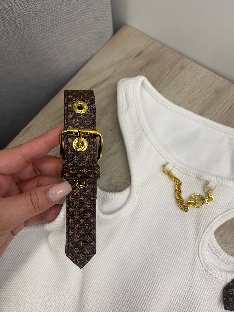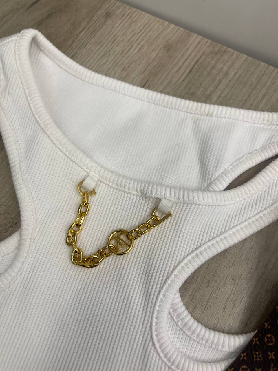 Майка Louis Vuitton LUX-104326 представляет собой стильный предмет гардероба. Белая майка в рубчик с утонченными деталями, сочетает в себе элегантность и комфорт. Подходит для создания различных образов, от повседневных до более изысканных.