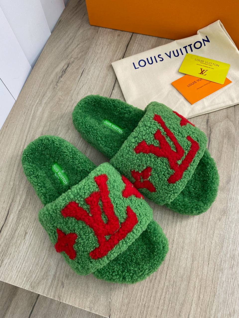 Меховые тапочки Louis Vuitton LUX-74062 - это яркий и стильный аксессуар для повседневной жизни. Зеленые тапочки с объемным логотипом Louis Vuitton красного цвета, представляют собой сочетание комфорта и узнаваемого дизайна. Они станут отличным дополнением к домашнему гардеробу, добавляя нотку роскоши и индивидуальности.