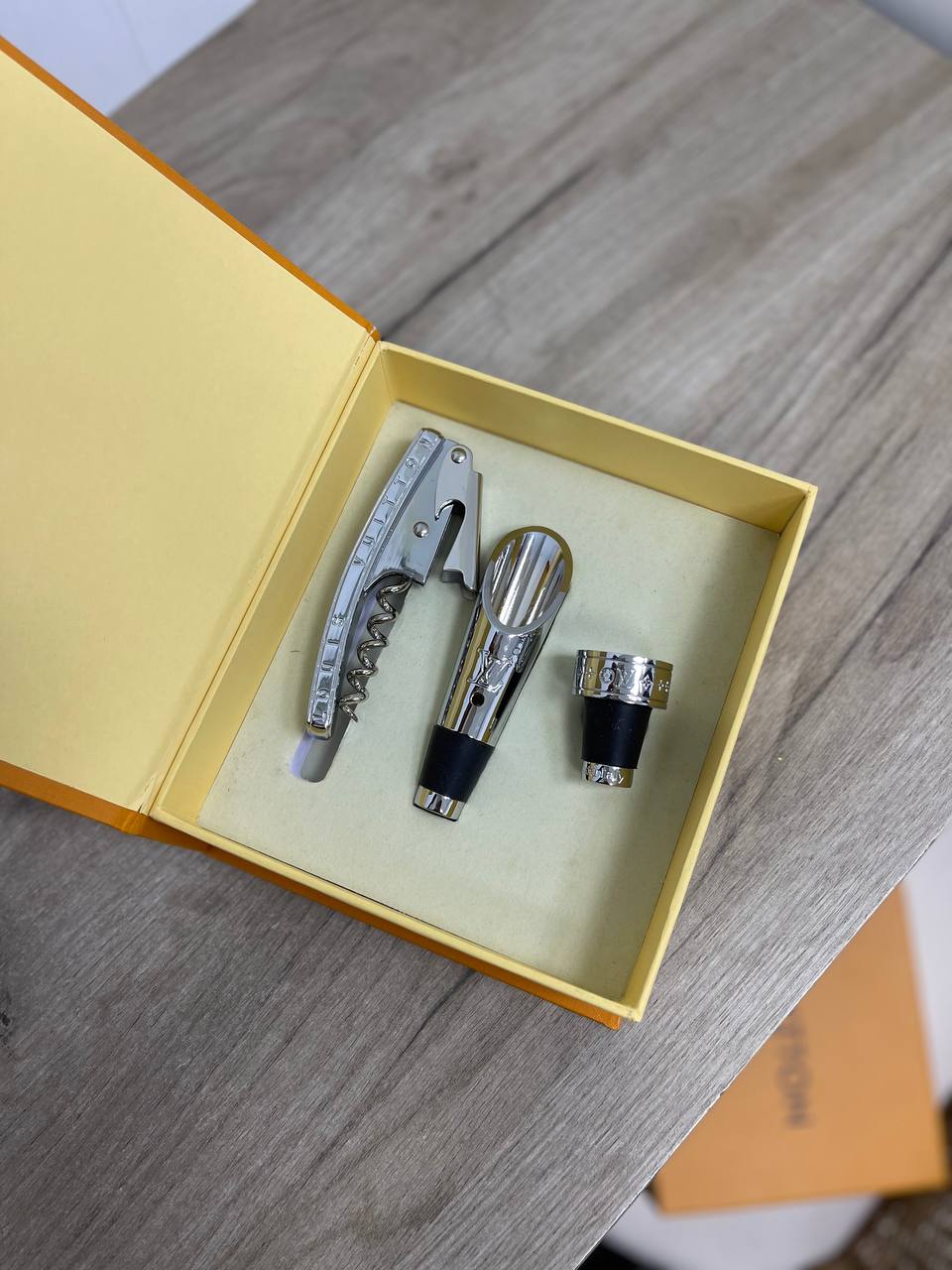 Набор Louis Vuitton LUX-83348 представляет собой изысканный аксессуар для ценителей вина. Он включает в себя набор инструментов для элегантного сервировки напитков, упакованный в фирменную коробку. Набор выполнен в классическом стиле, сочетающем функциональность и роскошь.