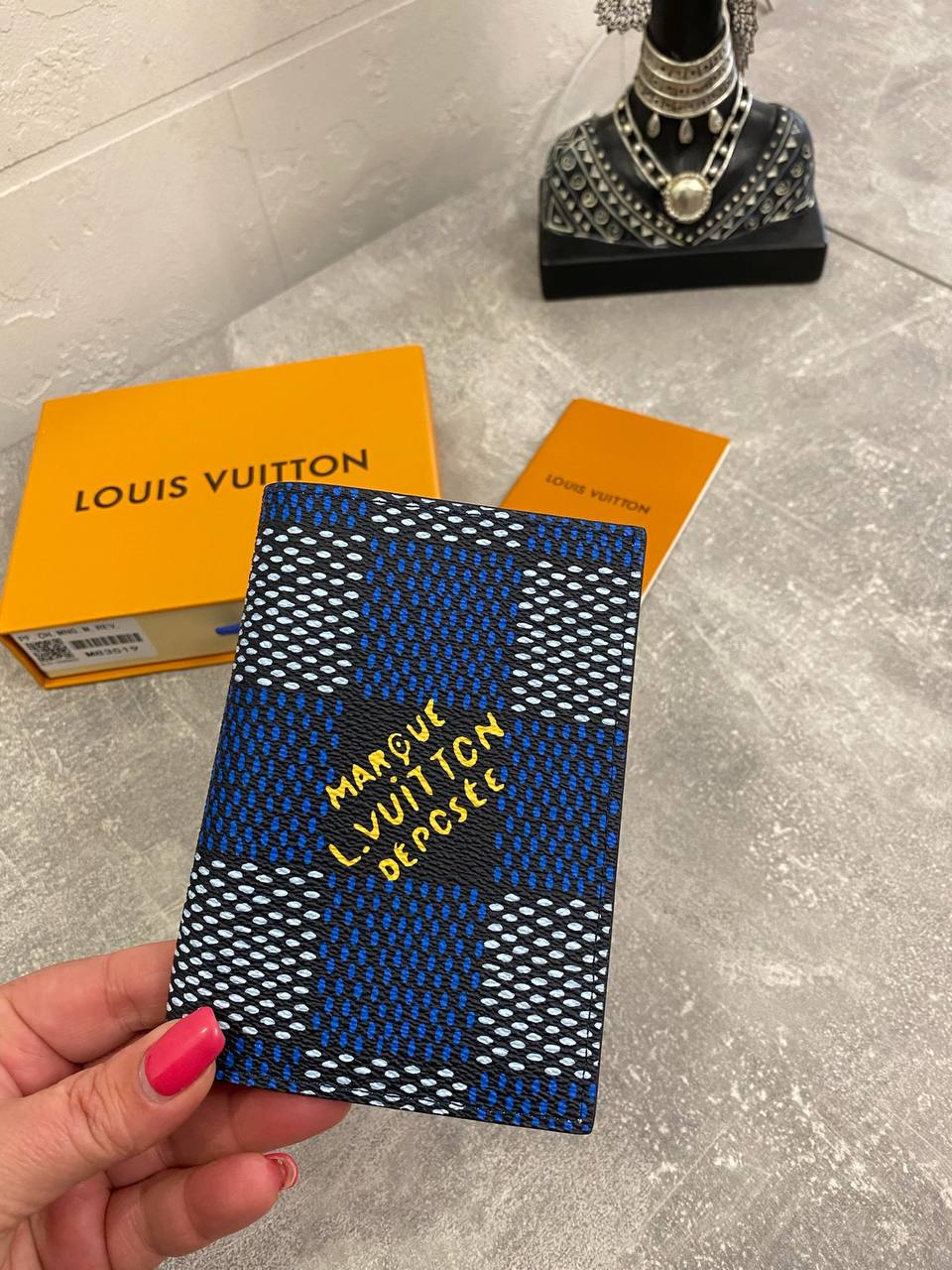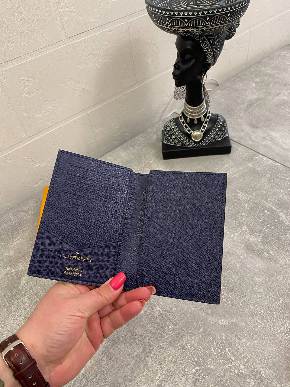 Обложка на паспорт Louis Vuitton LUX-106396 - стильный аксессуар, который подчеркнет вашу индивидуальность. Она выполнена в классическом стиле, сочетающем элегантность и практичность. Обложка выполнена в сочетании синего, белого и черного цветов, идеально подходящая для защиты вашего паспорта.
