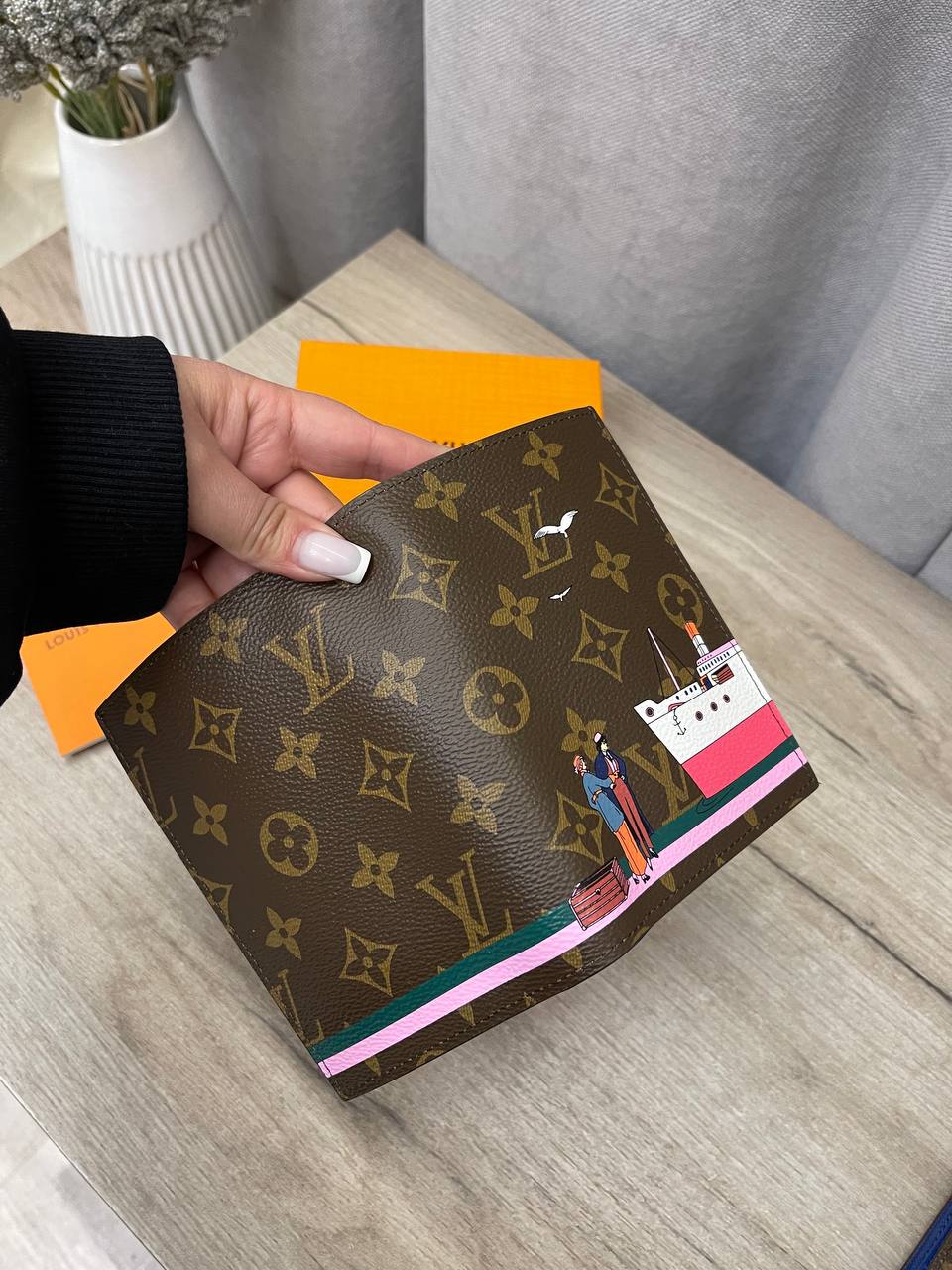 Обложка на паспорт Louis Vuitton LUX-114158 выполнена в классическом стиле бренда с уникальным дизайном. Коричневый фон украшен фирменным узором Monogram, а также изображением сцены с пароходом, что придает изделию оригинальность и элегантность. Предназначена для надежной защиты вашего паспорта.