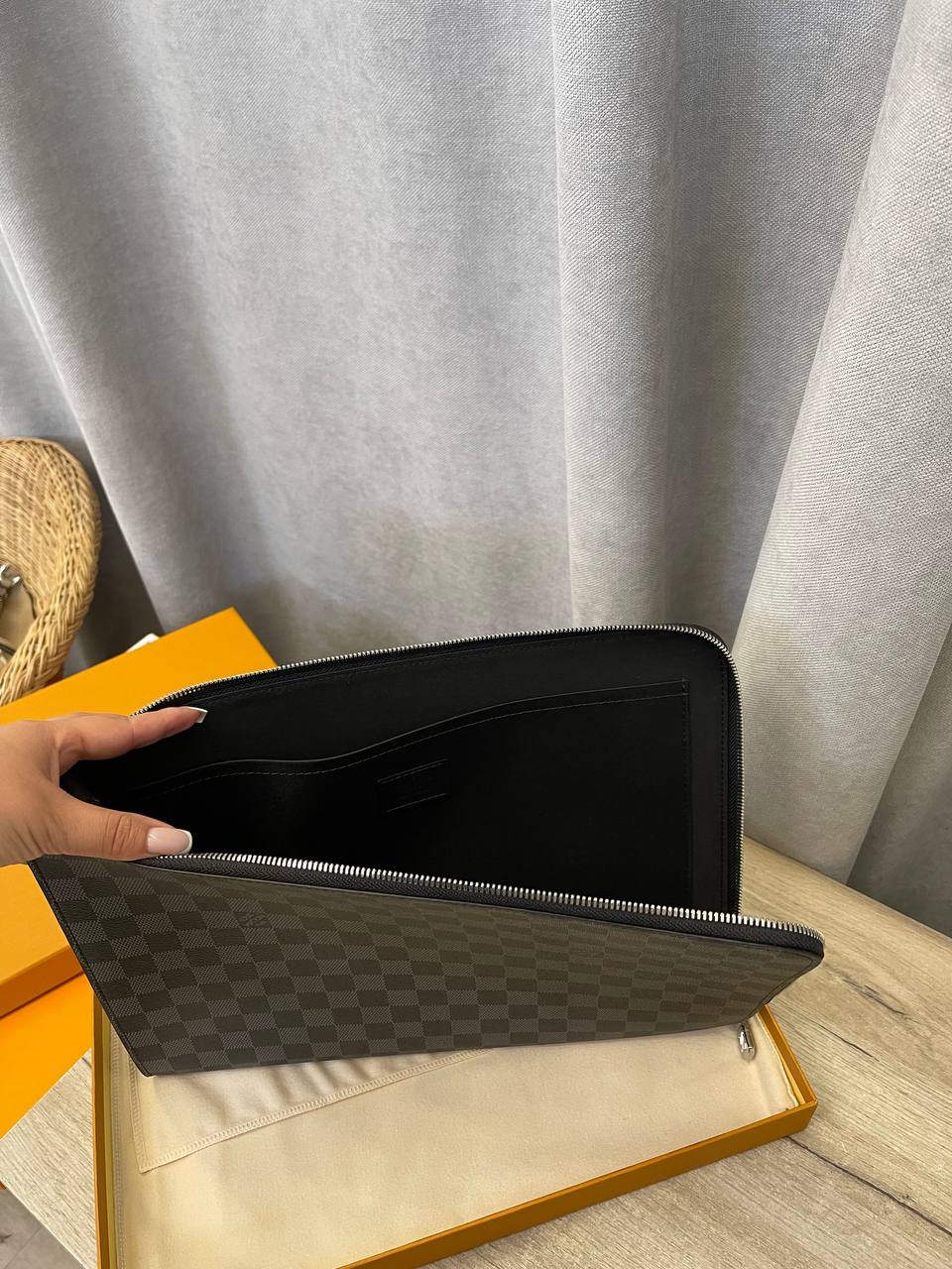 Папка Louis Vuitton LUX-109742 — это стильный аксессуар, выполненный в классическом дизайне. Папка выполнена в темном цвете с фирменным узором Damier Graphite. Такой аксессуар подойдет для хранения документов или в качестве повседневного клатча.