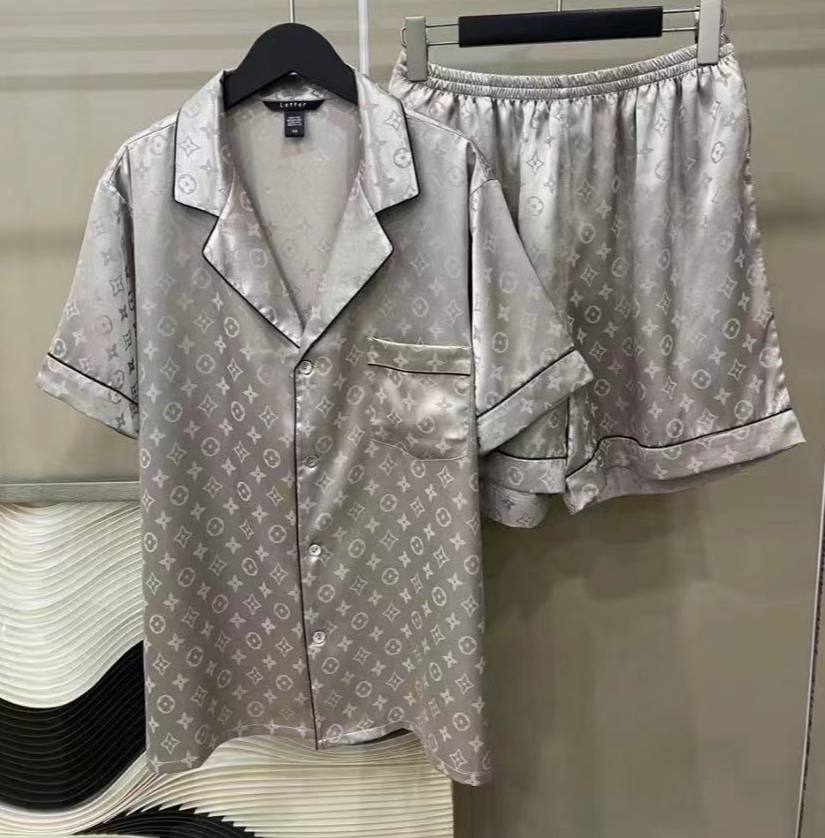 Пижама Louis Vuitton LUX-78600, представленная на изображении, – это изысканный комплект одежды для сна, сочетающий в себе роскошь и комфорт. Комплект выполнен в серебристом оттенке с фирменным узором бренда. Пижама представляет собой классический костюм с рубашкой с коротким рукавом и шортами.