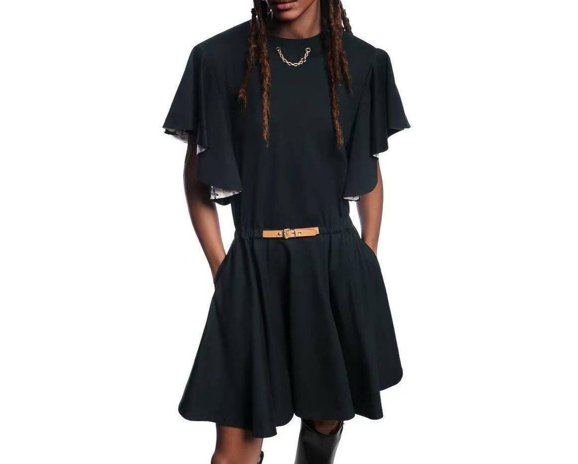 Платье Louis Vuitton LUX-116414 — это элегантное и стильное платье темно-зеленого цвета. Оно отличается свободным кроем с акцентом на талии, создавая женственный силуэт. Стиль платья подчеркивают короткие рукава и небольшой кожаный пояс.