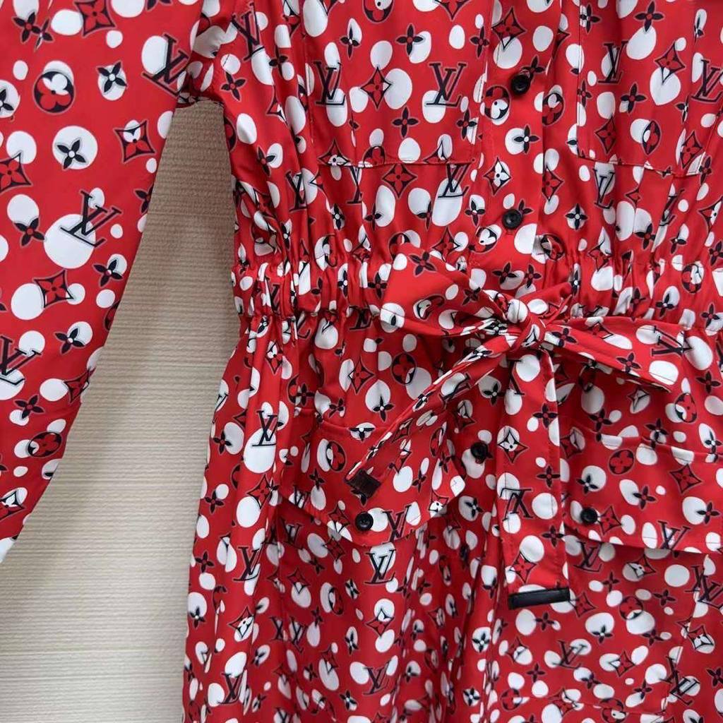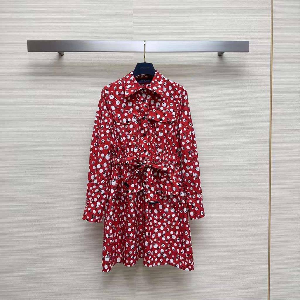 Платье Louis Vuitton LUX-85930 представляет собой стильное платье-рубашку с длинными рукавами, выполненное в ярком красном цвете с белым принтом в горошек. Платье имеет приталенный силуэт благодаря поясу на талии и классическому воротнику. Этот предмет гардероба идеально подходит для создания элегантных и запоминающихся образов.