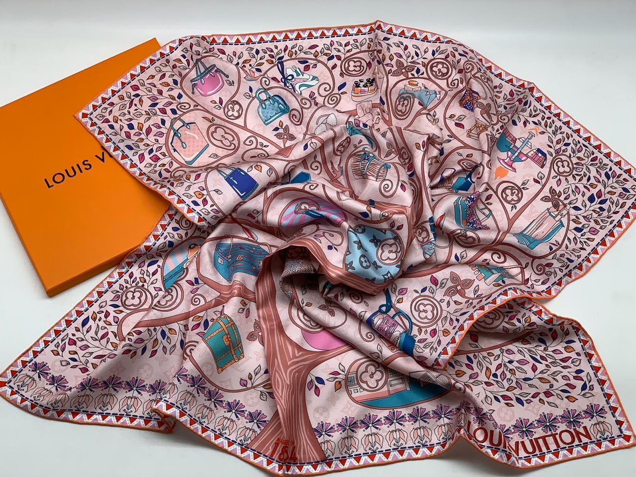 Платок Louis Vuitton LUX-30227 представляет собой изысканный аксессуар, выполненный в нежном розовом оттенке. Его дизайн украшен оригинальным принтом в виде стилизованного дерева с сумками, туфлями и цветами, напоминающими элементы фирменного монограммного узора. Этот платок идеально подойдет для создания элегантных и утонченных образов.