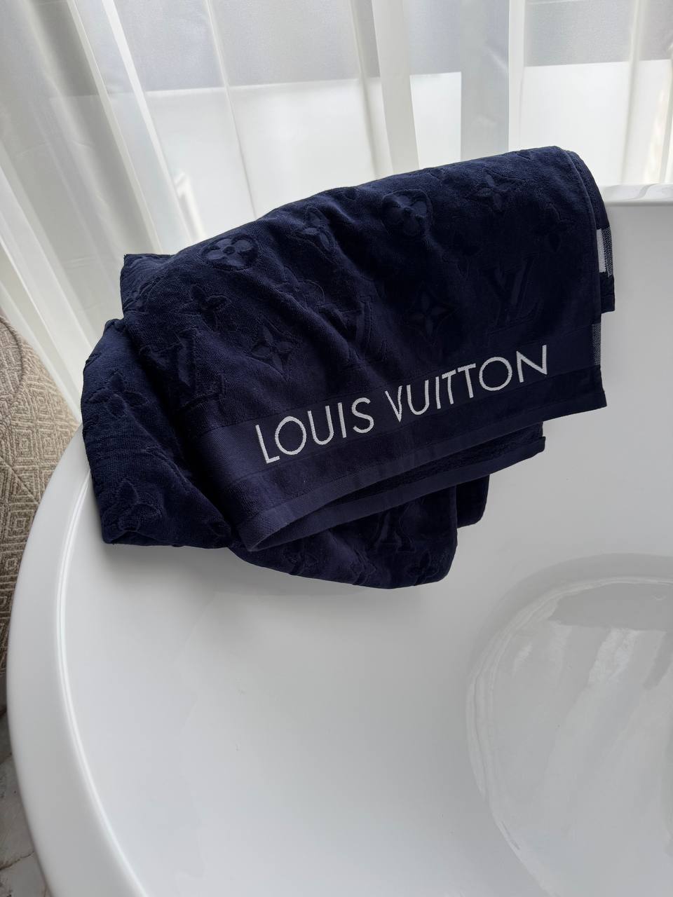 Полотенце Louis Vuitton LUX-119540 — это элегантное полотенце от известного бренда, выполненное в классическом стиле. Темно-синий цвет с рельефным узором и вышитым логотипом бренда создает изысканный вид. Идеально подходит для использования в ванной комнате или для пляжного отдыха.