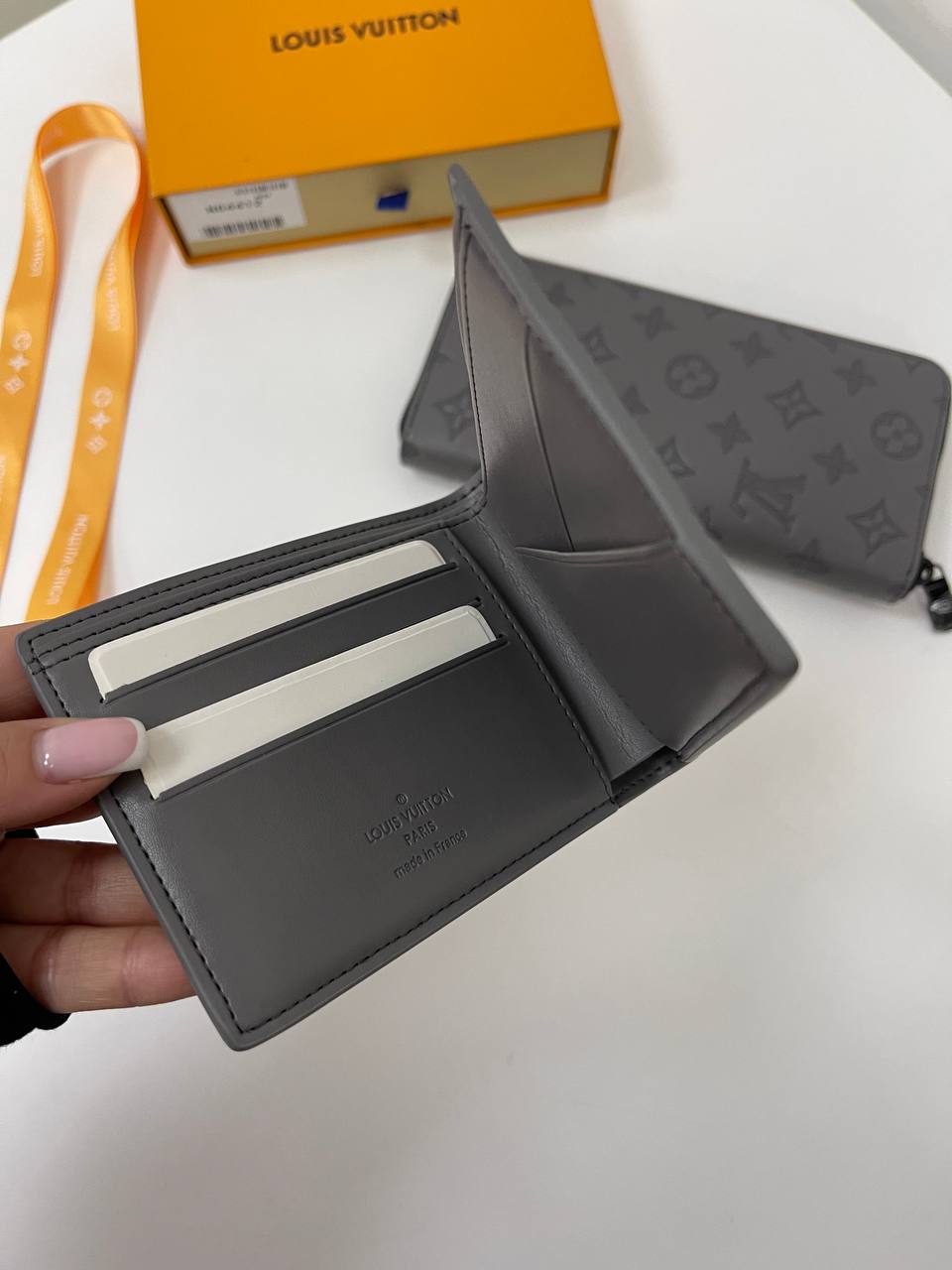 Портмоне Louis Vuitton LUX-82673 – это элегантный аксессуар от известного бренда, выполненный в классическом стиле. Серый цвет и тисненый узор в виде логотипа добавляют изысканности. Идеально подходит для хранения денег и карт, подчеркивая статус своего владельца.