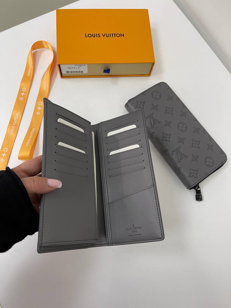 Портмоне Louis Vuitton LUX-82674 выполнено в классическом стиле с узнаваемым узором Monogram. Серый цвет придает аксессуару элегантность и универсальность. Идеально подходит для хранения денег, карт и документов.